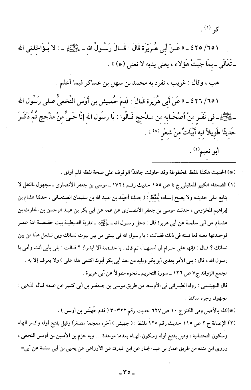 651/ 426 - "عَنْ أَبِي هُرَيرة قَالَ: قَدِمْ حُميش بن أَوْس النَّخعيُّ على رَسُول الله - صلى الله عليه وسلم - فِي نَفَرٍ مِنْ أَصْحَابِهِ مِن مذْحِج قَالُوا: يَا رسُول اللهِ إنَّا حَيٌّ مِنْ مذْحج ثُمَّ ذَكَرَ حَدِيثًا طَوِيلًا فِيهِ أَبْيَاتٌ مِنْ شِعْرٍ (*) ".