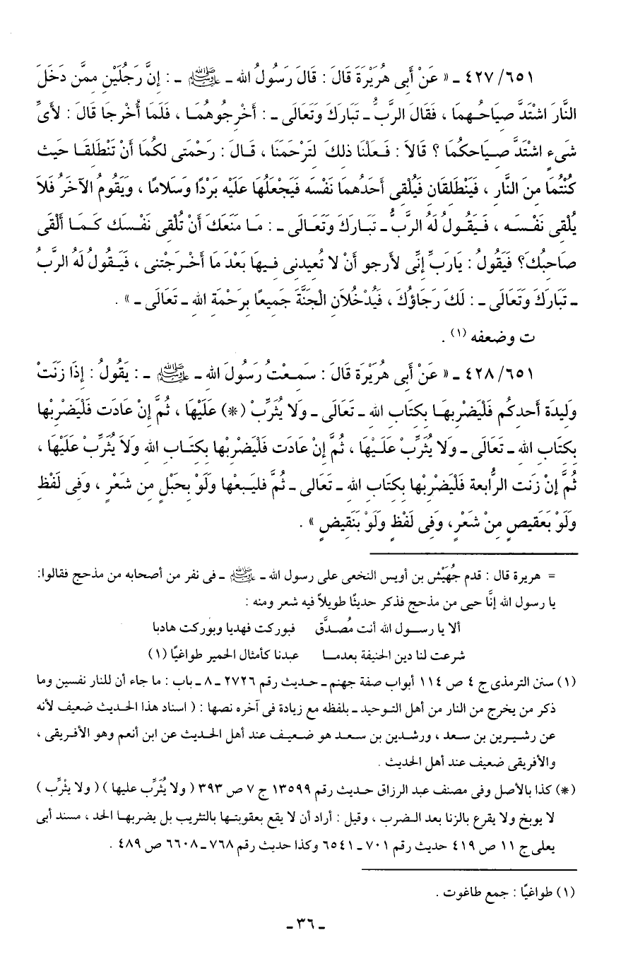 651/ 428 - "عَنْ أَبِي هُرَيْرَة قَالَ: سَمِعْتُ رَسُولَ اللهِ - صلى الله عليه وسلم -: يَقُولُ: إِذَا زَنَتْ وَلِيدَة أَحدِكُم فَلْيَضْرِبهَا بِكتَابِ اللهِ - تَعَالَى- وَلا يُثَرِّبْ (*) عَلَيْهَا، ثُمَّ إِنْ عَادَت فَلْيَضْرِبْها بِكتَابِ اللهِ - تَعَالَى- وَلا يُثَرِّبْ عَلَيْهَا، ثُمَّ إِنْ عَادَت فَلْيَضْرِبْها بِكِتَابِ اللهِ وَلَا يُثَرِّبْ عَلَيْهَا، ثُمَّ إنْ زَنت الرَّابعة فَلْيَضْرِبْها بِكِتَابِ اللهِ - تَعَالى- ثُمَّ فليَبعْها وَلَوْ بِحَبْلٍ مِن شَعْرٍ، وَفِي لَفْظِ وَلَوْ بَعَقيصٍ مِنْ شَعْرٍ، وَفِي لَفْظٍ وَلَوْ بَنَقِيضٍ".