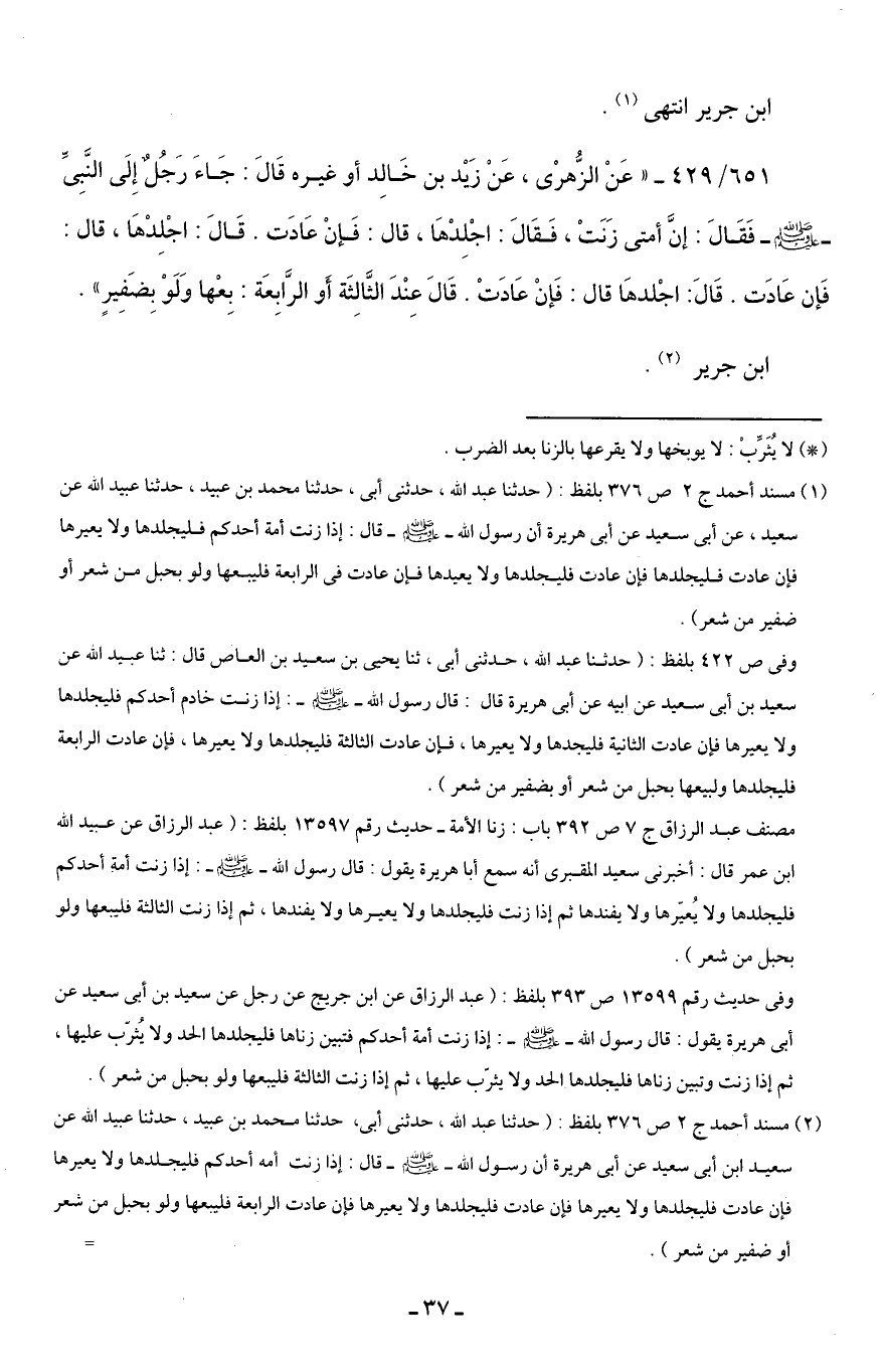651/ 429 - "عَنْ الزُّهرْي، عَنْ زَيْد بن خَالِد أو غيره قَالَ: جَاءَ رَجُلٌ إِلَى النَّبِيِّ - صلى الله عليه وسلم - فَقَالَ: إنَّ أمتي زَنَتْ، فَقَالَ: اجْلِدْهَا، قال: فَإنْ عَادَت. قَالَ: اجْلِدْهَا، قال: فَإن عَادَت. قَالَ: اجْلدهَا قال: فَإنْ عَادَتْ. قَالَ عِنْدَ الثَّالِثَة أَو الرَّابِعَة: بِعْها وَلَوْ بِضَفِيرٍ".