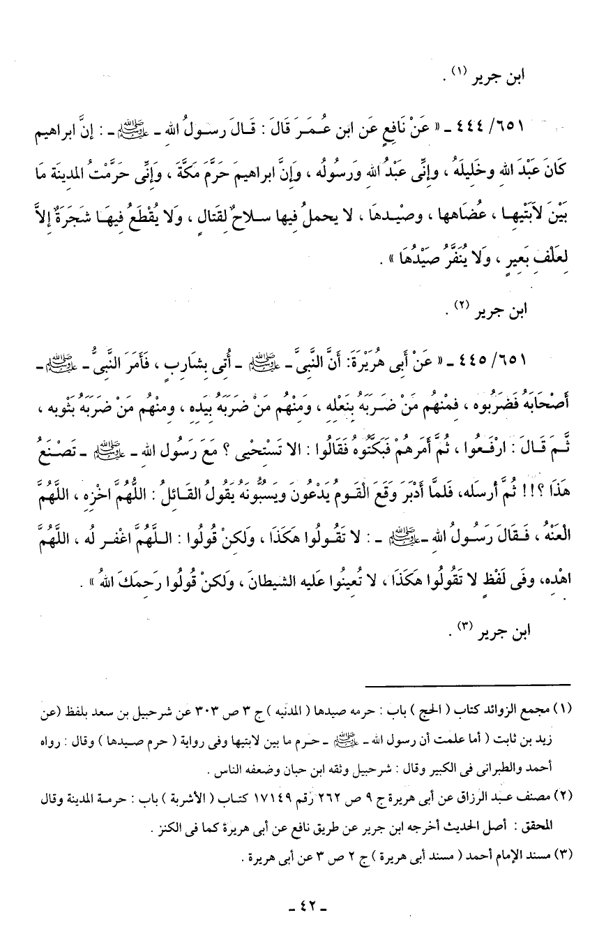 651/ 444 - "عَنْ نَافِعٍ عَن ابن عُمَرَ قَالَ: قَالَ رسولُ اللهِ - صلى الله عليه وسلم -: إنَّ إبراهيم كَانَ عَبْدَ اللهِ وخَلِيلَهُ، وإنِّي عَبْدُ اللهِ وَرسُولُه، وَإِنَّ إبراهيمَ حَرَّمَ مَكَّةَ، وَإِنِّي حَرَّمْتُ المدِينَة مَا بَيْنَ لاَبَتْيهِا، عُضَاهها، وصْيدهَا، لا يحملُ فِيها سلاحٌ لِقَتالٍ، وَلا يُقْطَعُ فِيهَا شَجَرَةٌ إِلَّا لِعَلْفِ بَعِيرٍ، وَلا يُنَفَّرُ صَيْدُهَا".