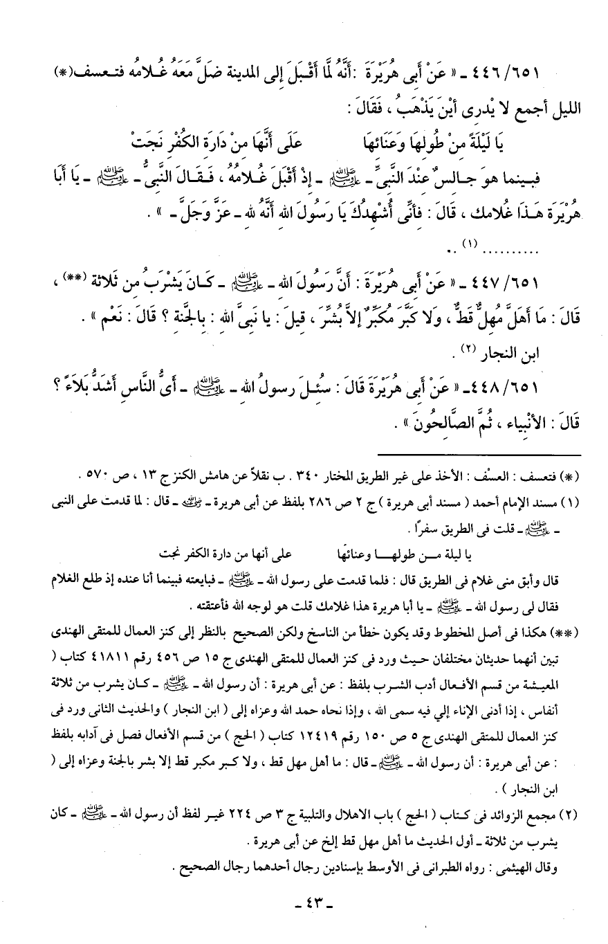 651/ 446 - "عَنْ أَبِي هُرَيْرَةَ: أَنَّهُ لمَّا أَقْبَلَ إِلى المدينة ضَلَّ مَعَهُ غُلامُه فتعسف (*) الليل أجمع لا يْدرِي أيْنَ يَذْهَبُ، فَقَالَ: