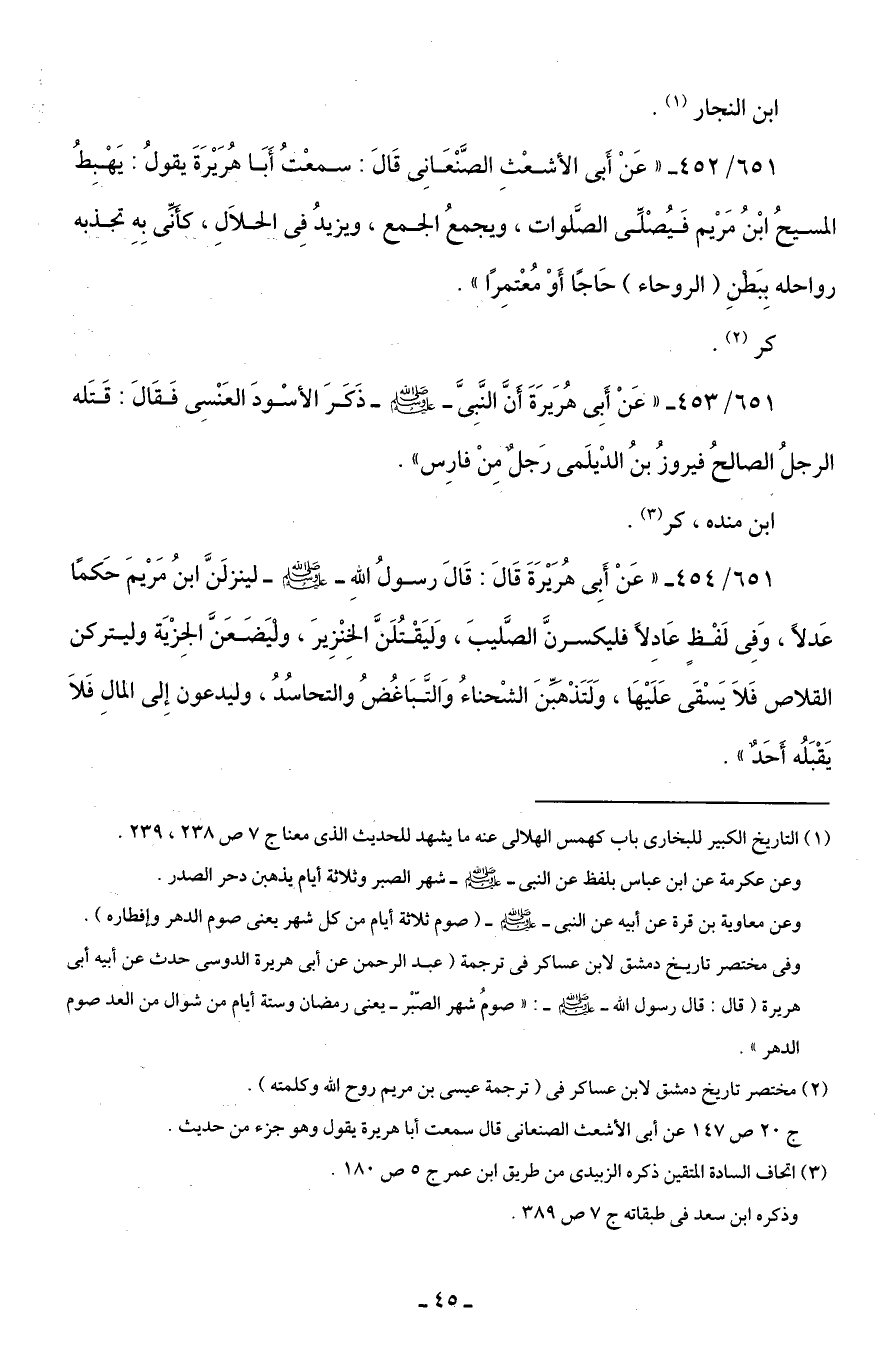 651/ 452 - "عَنْ أَبي الأشعْثِ الصَّنْعَانِي قَالَ سمعْتُ أَبَا هُرَيْرَةَ يقولُ: يَهْبِطُ المسيحُ ابْنُ مَرْيم فَيُصْلِّي الصَّلوات، ويجمعُ الجمع، ويزيدُ فِي الحلَالِ، كأَنِّي بِهِ تجذبه رواحله بِبَطْنِ (الروحاء) حَاجًا أَوْ مُعْتمِرًا".