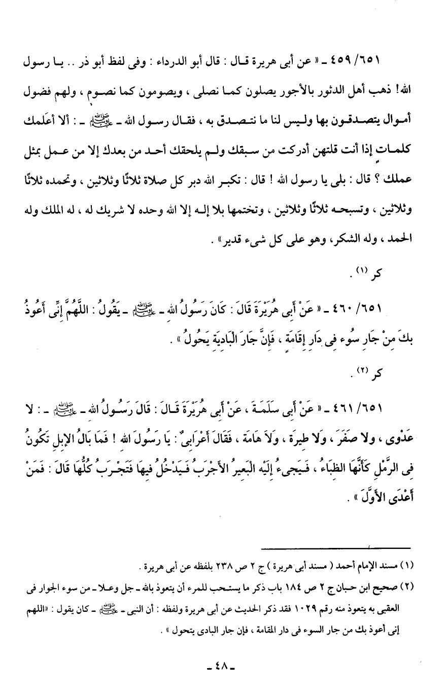 651/ 459 - "عن أبي هريرة قال: قال أبو الدرداء: وفي لفظ أبو ذر .. يا رسول الله! ذهب أهل الدثور بالأجور يصلون كما نصلي، ويصومون كما نصوم، ولهم فضول أموال يتصدقون بها وليس لنا ما نتصدق به، فقال رسول الله - صلى الله عليه وسلم -: ألا أعَلمك كلماتٍ إذا أنت قلتهن أدركت من سبقك ولم يلحقك أحد من بعدك إلا من عمل بمثل عملك؟ قال: بلى يا رسول الله! قال: تكبر الله دبر كل صلاة ثلاثًا وثلاثين، وتحمده ثلاثًا وثلاثين، وتسبحه ثلاثًا وثلاثين، وتختمها بلا إله إلا الله وحده لا شريك له، له الملك وله الحمد، وله الشكر، وهو على كل شيء قدير".