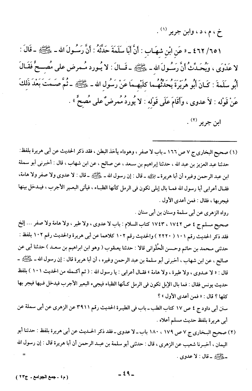 651/ 462 - "عَنِ ابْنِ شِهَابِ: أَنَّ أَبَا سَلَمَةَ حَدَّثَهُ: أَنَّ رَسُولَ الله - صلى الله عليه وسلم - قَالَ: لا عَدْوَى، وَيُحَدِّثُ أَنَّ رَسُولَ اللهِ - صلى الله عليه وسلم - قَالَ: لا يُورد مُمرض على مُصِحٍّ فَقَالَ أَبُو سَلَمةَ: كَانَ أَبُو هُرَيْرَةَ يُحَدِّثُهُما كِلَيْهِمَا عَنْ رَسُولِ الله - صلى الله عليه وسلم - ثُمَّ صَمَتَ بَعْدَ ذَلِكَ عَنْ قَوْله: لاَ عدوى، وَأَقَامَ عَلَى قَوْلِهِ: لا يُوردُ مُمرضٌ على مُصِحٍّ".