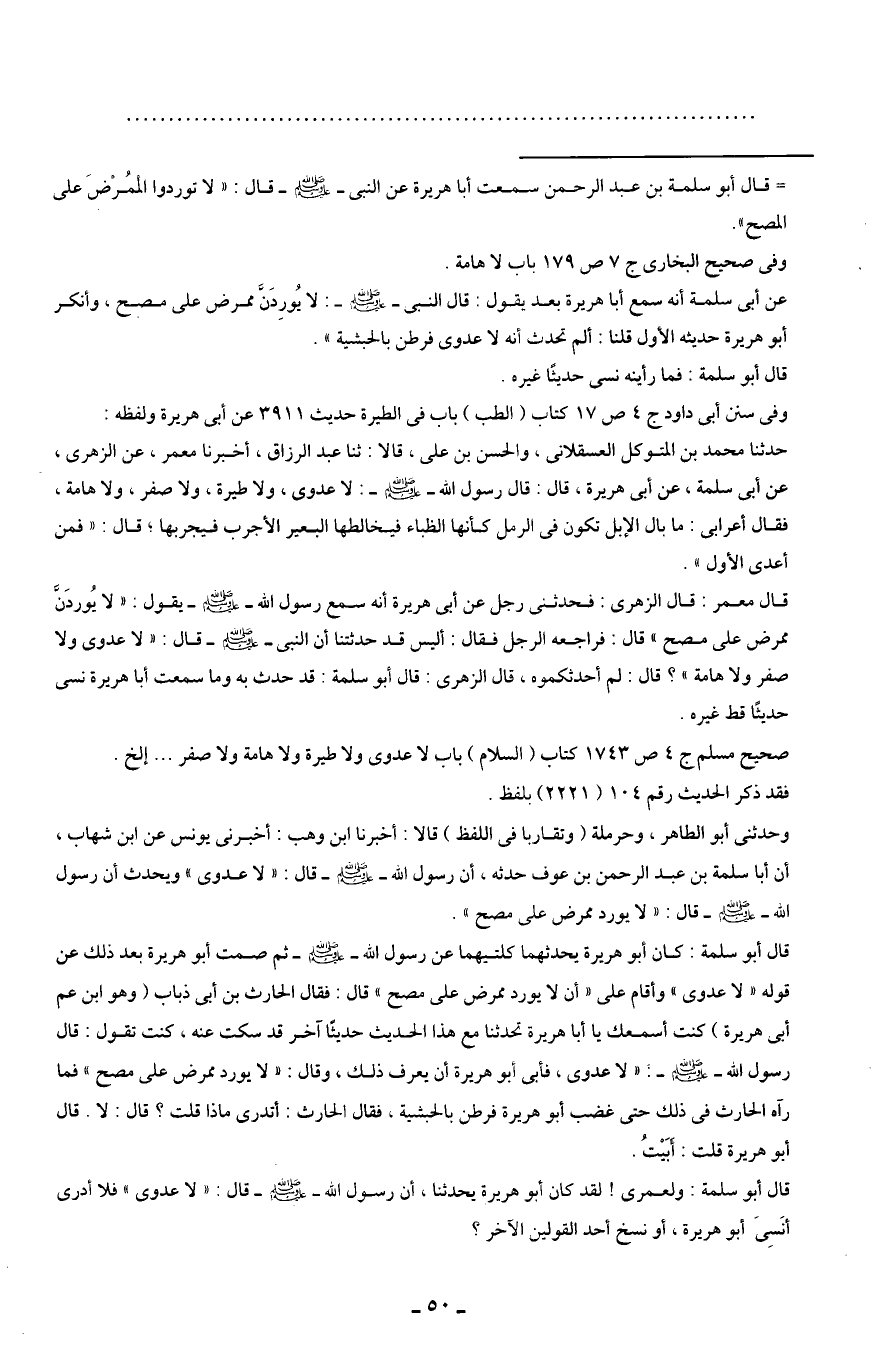 عن أبي سلمة أنه سمع أبا هريرة بعد يقول: قال النبي - صلى الله عليه وسلم -: لا يُورِدَنَّ ممرض على مصح، وأنكر أبو هريرة حديثه الأول قلنا: ألم تحدث أنه لا عدوى فرطن بالحبشية".