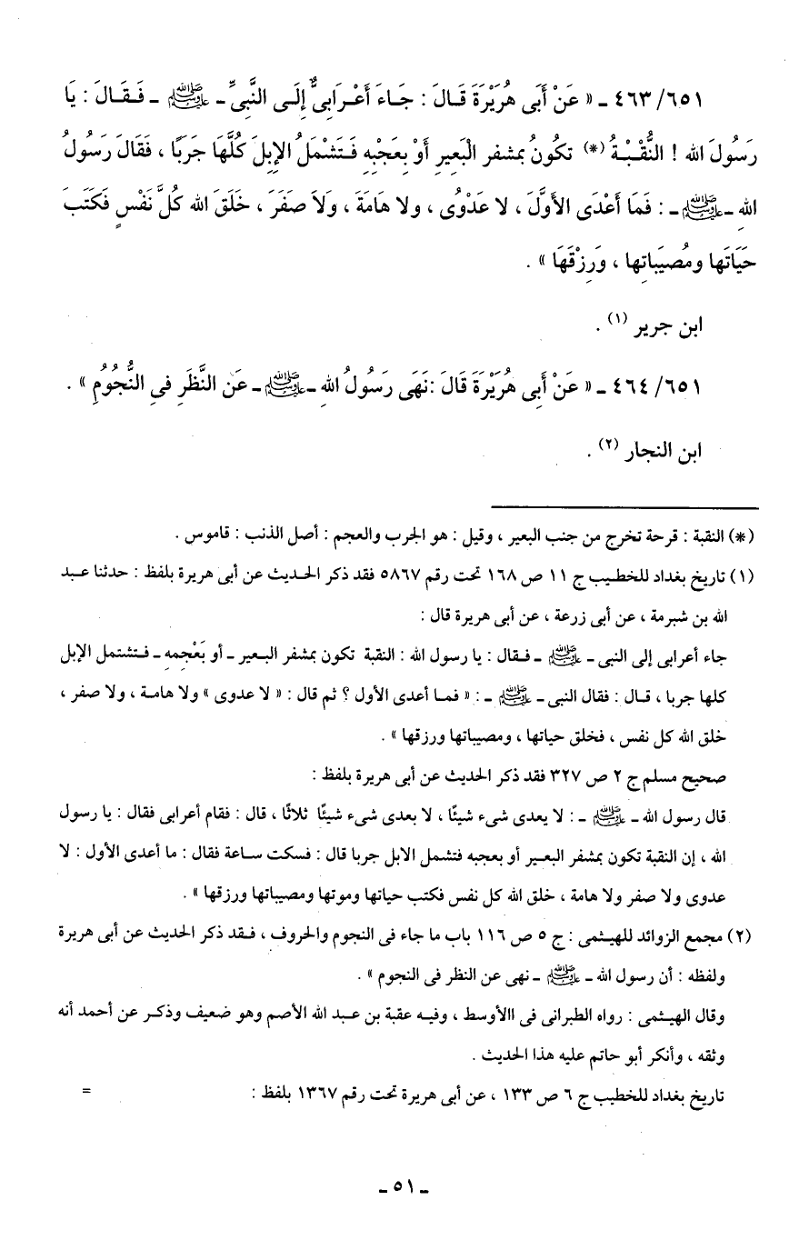 651/ 463 - "عَنْ أَبَي هُرَيْرَةَ قَالَ: جَاءَ أَعْرَابِيٌّ إِلَى النَّبِيِّ - صلى الله عليه وسلم - فَقَالَ: يَا رَسُولَ الله! النُّقْبْةُ (*) تكُونُ بمشفر الْبَعِيرِ أَوْ بِعَجْبِهِ فَتَشْمَلُ الإِبِلَ كُلَّهَا جَرَبًا، فَقَالَ رَسُولُ اللهِ - صلى الله عليه وسلم -: فَمَا أَعْدَى الأَوَّلَ، لا عَدْوُى، ولا هَامَةَ، وَلاَ صَفَرَ، خَلَقَ الله كُلَّ نَفْسٍ فَكَتَبَ حَيَاتَها ومُصيَباتِها، وَرِزْقَهَا".