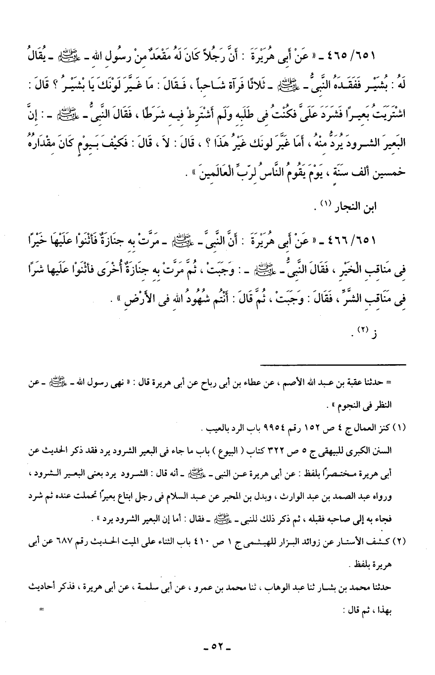651/ 465 - "عَنْ أَبِي هُرَيْرَةَ: أَنَّ رَجُلًا كَانَ لَهُ مَقْعَدٌ مِنْ رسُولِ اللهِ - صلى الله عليه وسلم - يُقَالُ لَهُ: بُشَيْر فَفَقَدَهُ النَّبِيُّ - صلى الله عليه وسلم - ثَلاثًا فَرآة شَاحِبًا، فَقَالَ: مَا غَيَّرَ لَوْنَكَ يَا بْشَيْرُ؟ قَالَ: اشْتَرَيَتُ بَعِيرًا فَشَرَدَ عَلَيَّ فكُنْتُ فِي طَلَبِهِ وَلَم أَشْتَرِطْ فِيهِ شَرَطًا، فَقَالَ النَّبِيُّ - صلى الله عليه وسلم -: إِنَّ البَعِيرَ الشرودَ يُرَدُّ مِنْهُ، أَمَا غَيَّرَ لونَك غَيْرُ هَذَا؟ ، قَالَ: لَا، قَالَ: فَكيْفَ بَيِوْمٍ كَانَ مِقْدَارُهُ خمسين ألف سَنَةٍ، يَوْمَ يَقُومُ النَّاسُ لِرّبِّ الْعَالَمِينَ".