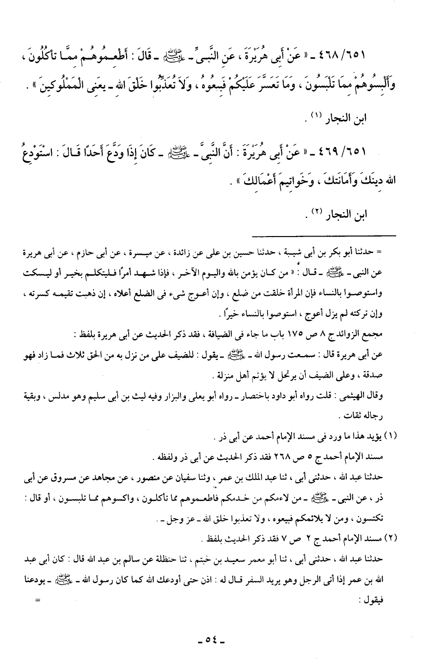 651/ 468 - "عَنْ أَبِي هُرَيْرَةَ، عَنِ النَّبيِّ - صلى الله عليه وسلم - قَالَ: أَطْعِمُوهُمْ مِمَّا تأكُلُونَ، وَأَلْبِسُوهُمْ مِمَا تَلْبَسُونَ، وَمَا تَعَسَّرَ عَلَيْكُمْ فَبِيعُوهُ، وَلاَ تُعَذِّبُوا خَلْقَ اللهِ - يعَنِي الْمَمْلُوكيِنَ".