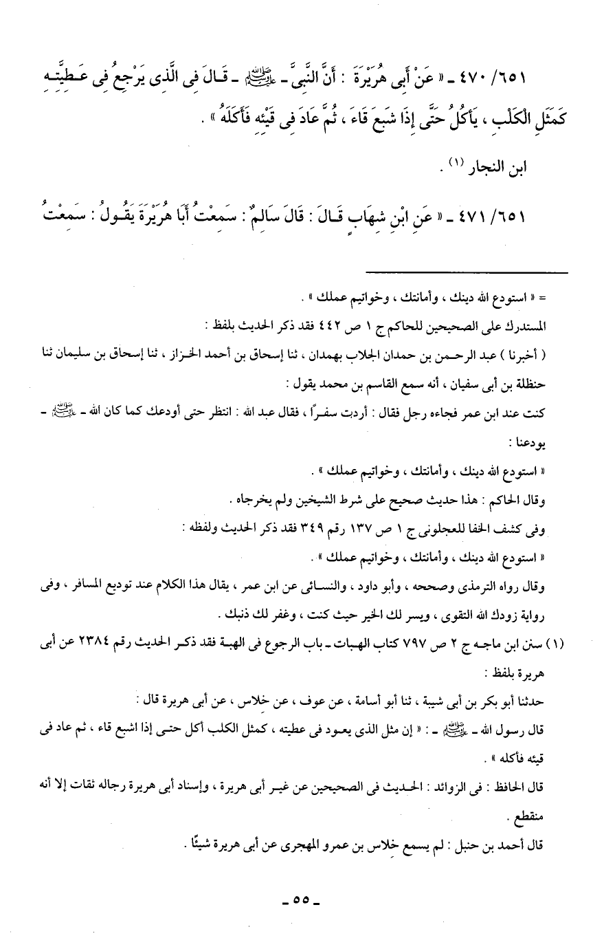 651/ 470 - "عَنْ أَبِي هُرَيْرَةَ: أَنَّ النَّبِيَّ - صلى الله عليه وسلم - قَالَ فِي الَّذِي يَرْجِعُ فِي عَطِيَّتِهِ كَمَثَلِ الْكَلْبِ، يَأكُلُ حَتَّى إِذَا شَبعَ قَاءَ، ثُمَّ عَادَ فِي قَيْئِهِ فَأَكَلَهُ".