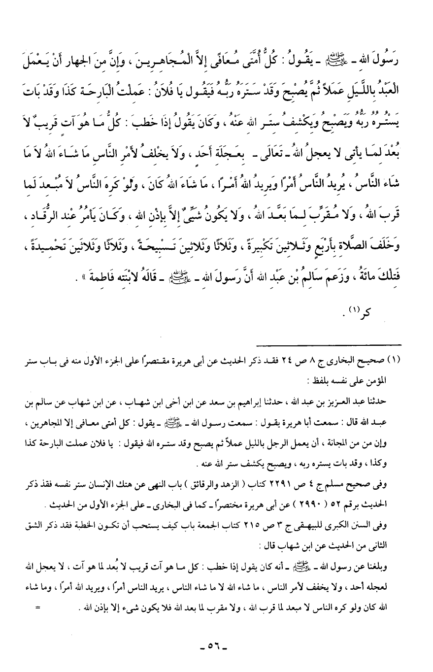 (¬1) صحيح البخاري ج 8 ص 24 فقد ذكر الحديث عن أبي هريرة مقتصرًا على الجزء الأول منه في باب ستر المؤمن على نفسه بلفظ: