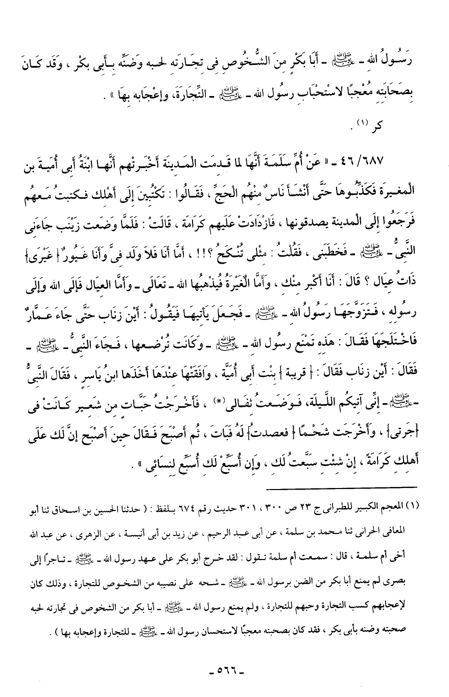 (¬1) المعجم الكبير للطبراني ج 23 ص 300، 301 حديث رقم 674 بلفظ: (حدثنا الحسين بن إسحاق ثنا أبو المعافي الحراني ثنا محمد بن سلمة، عن أبي عبد الرحيم، عن زيد بن أبي أنيسة، عن الزهري، عن عبد الله أخي أم سلمة، قال: سمعت أم سلمة تقول: لقد خرج أبو بكر على عهد رسول الله - صلى الله عليه وسلم - تاجرًا إلى بصرى لم يمنع أبا بكر من الضن برسول الله - صلى الله عليه وسلم - شحه على نصيبه من الشخوص للتجارة، وذلك كان لإعجابهم كسب التجارة وحبهم للتجارة، ولم يمنع رسول الله - صلى الله عليه وسلم - أبا بكر من الشخوص في تجارته لحبه صحبته وضنه بأبي بكر، فقد كان بصحبته معجبًا لإستحسان رسول الله - صلى الله عليه وسلم - للتجارة وإعجابه بها).