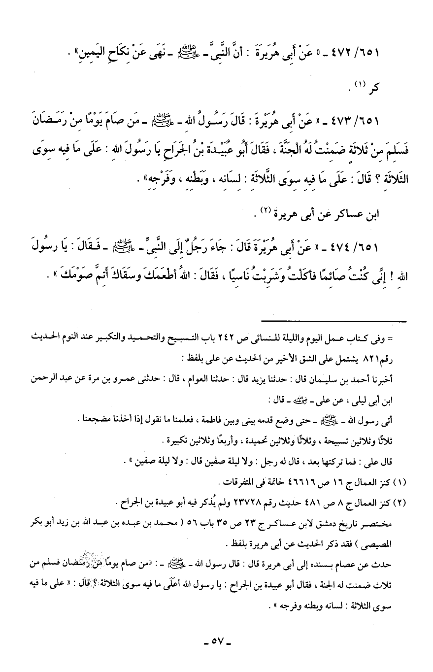651/ 473 - "عَنْ أَبِي هُرَيْرةَ: قَالَ رَسُولُ اللهِ - صلى الله عليه وسلم - مَن صَامَ يَوْمًا مِنْ رَمَضَانَ فَسَلِمَ مِنْ ثَلاثَةٍ ضَمِنْتُ لَهُ الْجَنَّةَ، فَقَالَ أَبُو عُبَيْدَة بْنُ الجَرَاحِ يَا رَسُولَ اللهِ: عَلَى مَا فِيه سِوَى الثَلاثَةِ؟ قَالَ: عَلَى مَا فِيهِ سِوَى الثَّلاثَةِ: لِسَانِه، وَبَطْنِهِ، وَفَرْجِهِ".