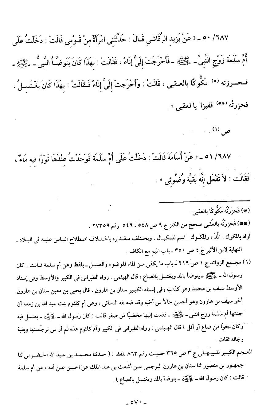 687/ 50 - "عَنْ يَزيدِ الرُقَاشيِ قَالَ: حَدَّثَتْنِي امْرَأَةٌ مِنْ قَوْمِي قَالَتْ: دَخَلْتُ عَلَى أُمِّ سَلَمَة زَوْجِ النَّبِيِّ - صلى الله عليه وسلم - فَأَخْرَجَتْ إِلَيَّ إنَاءً، فَقَالَتْ: بِهَذَا كَانَ يَتَوضَّأُ النَّبِيُّ - صلى الله عليه وسلم - فحرزته (*) مَكُّوكًا بالعقبى، قَالَتْ: وَأَخْرَجتْ إِلَيَّ إِنَاءً فَقَالَتْ: بِهَذَا كَانَ يَغْتَسِلُ، فحزرتْه (* *) قفيزا يا لعقبى".
