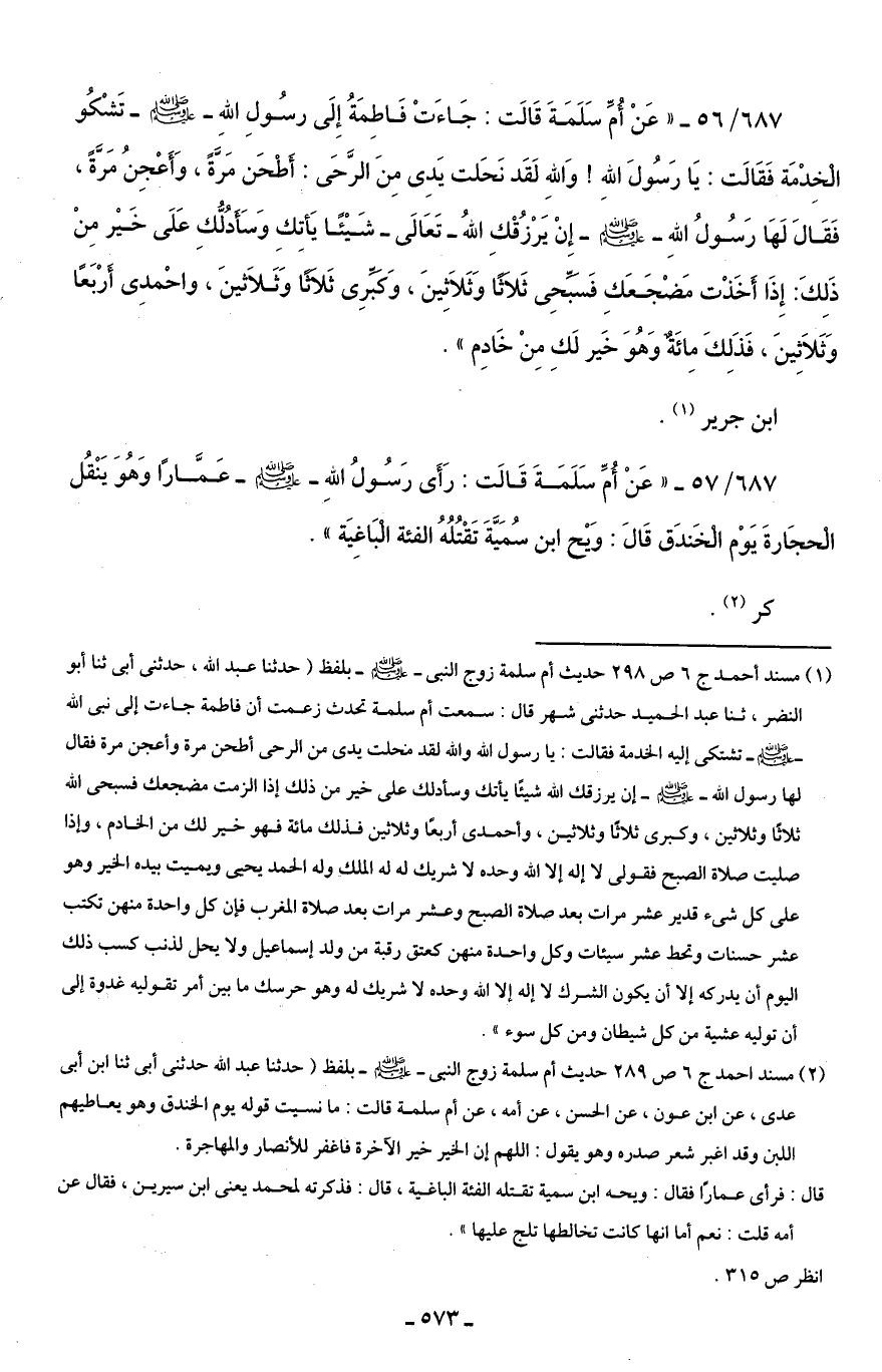 687/ 57 - "عَنْ أُمِّ سَلَمَةَ قَالَت: رَأَى رَسُولُ اللهِ - صلى الله عليه وسلم - عَمَّارًا وَهُوَ يَنْقُل الْحجَارةَ يَوْم الْخَندَق قَالَ: وَيْح ابن سُمَيَّةَ تَقْتُلُهُ الفئة الْبَاغِيَة".