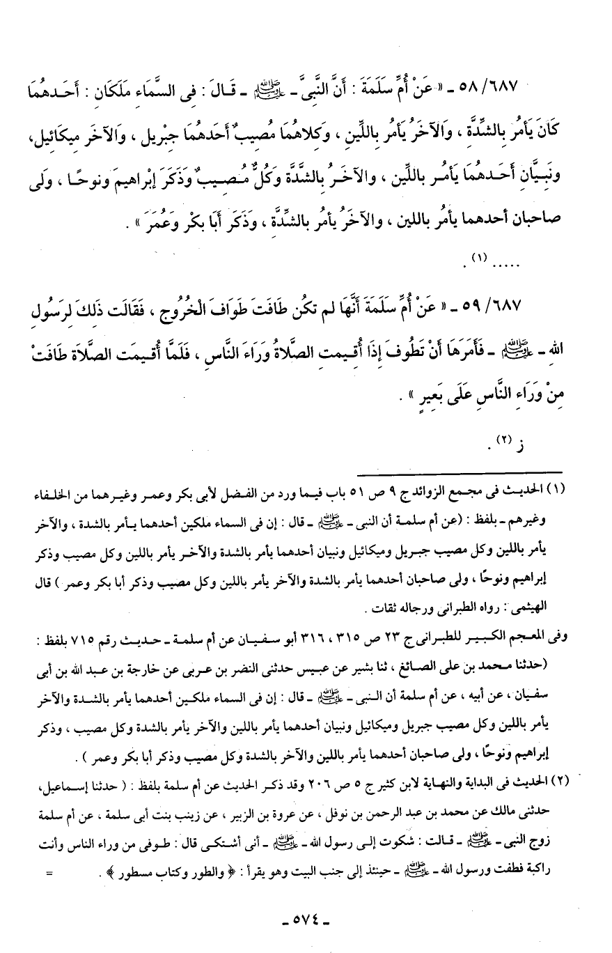 687/ 58 - "عَنْ أُمِّ سَلَمَةَ: أَنَّ النَّبِيَّ - صلى الله عليه وسلم - قَالَ: فِي السَّمَاءِ مَلَكَانِ: أَحَدهُمَا كَانَ يَأمُر بِالشِّدَّةِ، وَالآخَرُ يَأَمُر بِاللِّينِ، وَكِلاهُمَا مُصِيبٌ أَحَدهُمَا جِبْريل، وَالآخَر مِيكَائِيل، ونَبِيَّانِ أَحَدهُمَا يَأمُر باللِّين، والآخَرُ بِالشَّدَّة وَكُلٌّ مُصِيبٌ وَذَكَرَ إبْراهيمَ ونوحًا، وَلي صاحبان أحدهما يأمُر باللين، والآخَرُ يأمُر بالشِّدَّةِ، وَذَكَر أَبَا بكْر وَعُمَرَ".