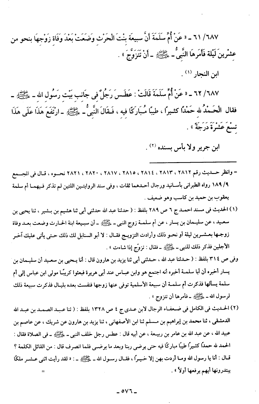 687/ 61 - "عَنْ أُمِّ سَلَمَةَ أَنَّ سبيعَة بِنْتَ الْحَرْثِ وَضَعَتْ بَعْدَ وَفَاةِ زَوْجِهَا بنحو من عِشْرينَ لَيْلة فَأَمَرهَا النَّبِيُّ - صلى الله عليه وسلم - أَنْ تَتَزَوَّجَ".