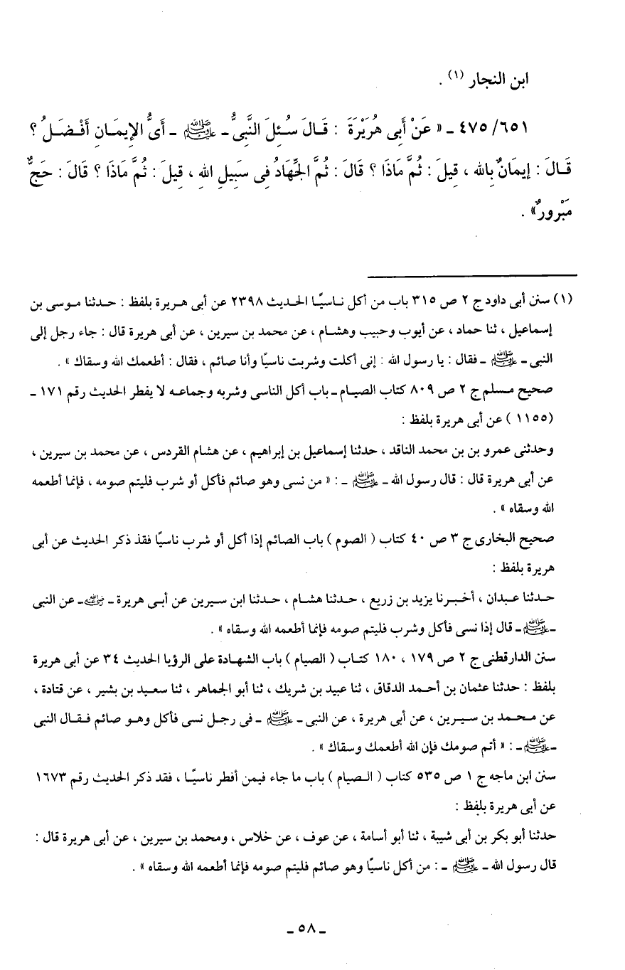 651/ 475 - "عَنْ أَبِي هُرَيْرَةَ: قَالَ سُئِلَ النَّبِيُّ - صلى الله عليه وسلم - أَيُّ الإِيمَانِ أَفْضَلُ؟ قَالَ: إيمَانٌ بِالله، قِيلَ: ثُمَّ مَاذَا؟ قَالَ: ثُمَّ الجِهَادُ فِي سَبِيلِ اللهِ، قِيلَ: ثُمَّ مَاذَا؟ قَالَ: حَجٌّ مَبْرورٌ".