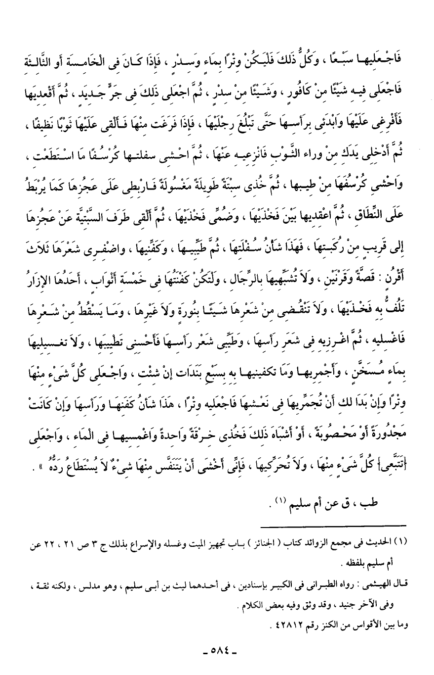 فَاجْعَلِيها سَبْعًا، وَكُلُّ ذَلكَ فَلْيَكُنْ وِتْرًا بِمَاءٍ وَسِدْرٍ، فَإِذَا كَانَ فِي الْخَامِسَةِ أَو الثَّالِثَةِ فَاجْعَلِي فِيهِ شَيْئًا مِنْ كَافُورٍ، وَشَيْئًا مِنْ سِدْرٍ، ثُمَّ اجْعَلِي ذَلِكَ فِي جَرٍّ جَدِيَدٍ، ثُمَّ أَقْعِدِيهَا فَأَفْرِغِي عَلَيْهَا وَابْدَئِي بِرَأسِهَا حَتَّى تَبْلُغَ رِجْلَيْهَا، فَإِذَا فَرَغَت مِنْهَا فَأَلْقِي عَلَيْهَا ثَوْبًا نَظِيفًا، ثُمَّ أَدْخِلِي يَدَكِ مِنْ وراء الثَّوْبِ فَانْزِعِيهِ عَنْهَا، ثُمَّ احْشِي سفلتها كُرْسُفًا مَا اسْتَطَعْتِ، وَاحْشيِ كُرْسُفَهَا مِنْ طِيبها، ثُمَّ خُذِي سِبْتَةً طَوِيلَةً مَغْسُولَةً فَارْبِطِي عَلَى عَجُزِهَا كَمَا يُرْبَطُ عَلَى النِّطَاقِ، ثُمَّ اعْقِدِيها بَيْنَ فَخْذَيْهَا، وَضُمِّي فَخْذَيْهَا، ثُمَّ أَلْقِي طَرَفَ السَّبْتِيَّة عَنْ عَجُزِهَا إِلى قَرِيبٍ مِنْ رُكَبتِهَا، فَهَذَا شَأْنُ سُفْلَتِهَا، ثُمَّ طَيِّبِيهَا، وَكَفِّنِيهَا، واضْفِرِي شَعْرَهَا ثَلَاثَ أَقْرُنٍ: قَصَّةً وَقَرْنَيْنِ، وَلَا تُشَبِّهِيهَا بِالرِّجَالِ، وَلْتَكُنْ كَفْنَتُهَا فِي خَمْسَةِ أَثْوَابٍ، أَحَدُهَا الإِزَارُ تَلُفُّ بِهِ فَخْذَيْهَا، وَلَا تَنْقُضِي مِنْ شَعْرِهَا شَيئًا بِنُورَةٍ وَلَا غَيْرِهَا، وَمَا يَسْقُطُ مِنْ شَعْرِهَا فَاغْسِليهِ، ثُمَّ اغْرِزِيهِ فِي شَعَرِ رَأسِهَا، وَطَيِّبِي شَعْر رَأسِهَا فَأَحْسِنِي تَطْيِيبَها، وَلَا تغسِيلِيهَا بِمَاءٍ مُسَخَّنٍ، وَأَجْمِرِيها وَمَا تكفينيها بِهِ بِسَبْعِ بَنَدَات إنْ شِئْتِ، وَاجْعَلِي كُلَّ شَيْءٍ مِنْهَا وِتْرًا وِإنْ بَدَا لكِ أَنْ تُجَمِّريِهَا فِي نَعْشِهَا فَاجْعَلِيه وِتْرًا، هَذَا شَأنُ كَفَنِهَا وَرَأسِهَا وَإِنْ كَانَتْ مَجْدُورَةً أوْ مَحْصُوبَةً، أَوْ أَشْبَاهَ ذَلِكَ فَخُذِي خِرْقَةً وَاحِدةً وَاغْمِسِيها فِي الْمَاءِ، وَاجْعَلِي [تَتَبَّعِي] كُلَّ شَيْءٍ مِنْهَا، وَلَا تُحَرِّكيهَا، فَإِنِّي أَخْشَى أَنْ يَتَنَفَّس مِنْهَا شِيْءٌ لَا يُسْتَطَاعُ رَدُّهُ".