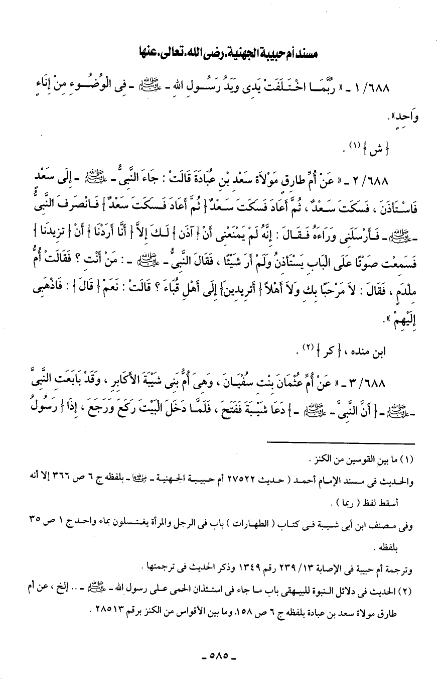 688/ 2 - "عَنْ أُمِّ طارِقٍ مَوْلَاة سَعْدِ بْنِ عُبَادَةَ قَالَتْ: جَاءَ النَّبِيُّ - صلى الله عليه وسلم - إِلَى سَعْدٍ فَاسْتَأذَنَ، فَسَكَتَ سَعْدٌ، ثُمَّ أَعَادَ فَسَكَتَ سَعْدٌ [ثُمَّ أَعَادَ فَسَكَتَ سَعْدٌ] فَانْصَرفَ النَّبِيُّ - صلى الله عليه وسلم - فَأَرْسَلَنِي وَرَاءَهُ فَقَالَ: إِنَّهُ لَمْ يَمْنَعْنِي أَنْ [آذَن] لَكَ إِلَّا [أَنَّا أَرَدْنَا] أَنْ [تزِيدَنا] فَسَمِعْت صَوْتًا عَلَى الْبَابِ يَسْتَأذِنُ وَلَمْ أَرَ شَيْئًا، فَقَالَ النَّبِيُّ - صلى الله عليه وسلم -: مَنْ أَنْتِ؟ فَقَالَتْ أُمُّ مِلْدَمٍ، فَقَالَ: لَا مَرْحَبًا بِكِ وَلَا أَهْلًا [أَترِيدِينَ] إِلَى أَهْلِ قُبَاءَ؟ قَالَتْ: نَعَمْ [قَالَ]: فَاذْهَبِي إِلَيْهِمْ".