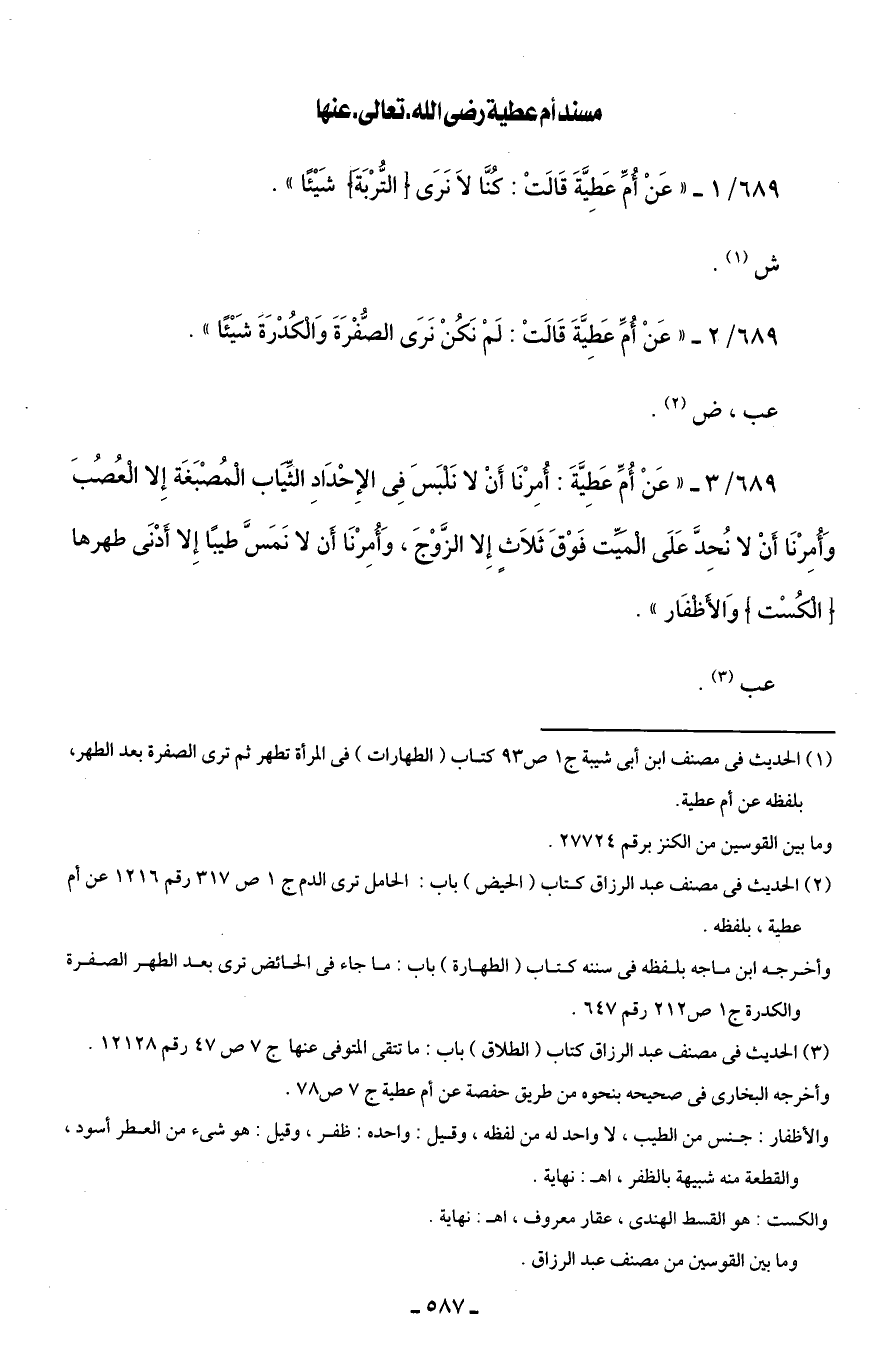 689/ 2 - "عَنْ أُمِّ عَطِيَّةَ قَالَتْ: لَمْ نَكُنْ نَرَى الصُّفْرَةَ وَالْكُدْرَةَ شَيْئًا"