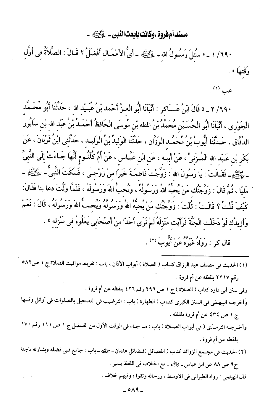 وأخرجه البيهقى في السنن الكبرى كتاب (الطهارة) باب: الترغيب في التعجيل بالصلوات في أوائل وقتها جـ 1 ص 434 عن أم فروة بلفظه.
