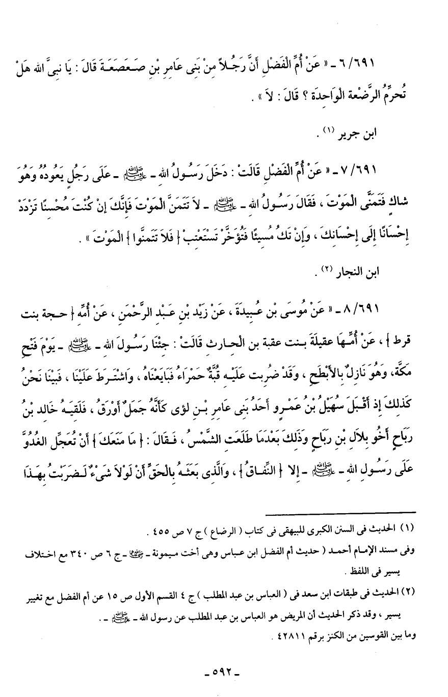 691/ 8 - "عَنْ مُوسَى بْن عُبِيدَةَ، عَنْ زَيْد بْنِ عَبْدِ الرَّحْمَنِ، عَنْ أُمِّهِ [حجة بنت قرط]، عَنْ أُمِّهَا عقيلَةَ بنت عقبة بن الْحِارثِ قَالَتْ: جِئْنَا رَسُولَ اللَّهِ -صلى اللَّه عليه وسلم- يَوْمَ فَتْحِ مَكَّة، وَهُوَ نَازِلٌ بِالأَبْطَحِ، وَقَدْ ضُرِبت عَلَيْهِ قُبَّةٌ حَمْرَاءُ فَبَايَعْنَاهُ، وَاشْتَرَطَ عَلَيْنَا، فَبيْنَا نَحْنُ كَذلِكَ إِذ أَقْبَلَ سُهَيْلُ بْنُ عَمْرٍو أَحَدُ بَنِى عَامِرِ بْنِ لؤى كَأَنَّهُ جَمَلٌ أَوْرَقُ، فَلَقِيَهُ خَالِد بْنُ رَبَاحٍ أَخُو بِلَالِ بْنِ رَبَاحٍ وَذَلِكَ بَعْدَمَا طَلَعَتِ الشَّمْسُ، فَقَالَ: [مَا مَنَعَكَ] أَنْ تُعَجِّل الغُدُوَّ عَلَى رَسُولِ اللَّهِ -صلى اللَّه عليه وسلم- إِلا [النِّفاقُ]، وَالَّذِى بَعَثَهُ بِالْحَقِّ أَنْ لَوْلَا شَىْءٌ لَضَرَبْتُ بِهَذَا