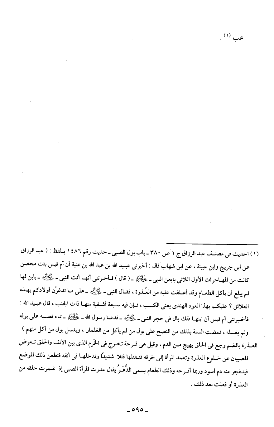 (¬1) الحديث في مصنف عبد الرزاق جـ 1 ص 380 - باب بول الصبي - حديث رقم 1486 بلفظ: (عبد الرزاق عن ابن جريج وابن عيينة، عن ابن شهاب قال: أخبرنى عبيد اللَّه بن عبد اللَّه بن عتبة أن أم قيس بنت محصن كانت من المهاجرات الأول اللاتى بايعن النبى -صلى اللَّه عليه وسلم- (قال) فأخبرتنى أنها أتت النبى -صلى اللَّه عليه وسلم- بابن لها لم يبلغ أن يأكل الطعام وقد أعلقت عليه من العُذرة، فقال النبى -صلى اللَّه عليه وسلم- على ما تدغرْن أولادكم بهذه العلائق؟ عليكم بهذا العود الهندى يعنى الكسب، فإن فيه سبعة أشفية منها ذات الجنب، قال عبيد اللَّه: فأخبرتنى أم قيس أن ابنها ذلك بال في حجر النبى -صلى اللَّه عليه وسلم- فدعا رسول اللَّه -صلى اللَّه عليه وسلم- بماء فصبه على بوله ولم يغسله، فمضت السنة بذلك من النضح على بول من لم يأكل من الغلمان، ويغسل بول من أكل منهم). العذرة بالضم وجع في الحلق يهيج من الدم، وقيل هى قرحة تخرج في الخَرم الذى بين الأنف والحلق تعرض للصبيان عن خلوع العذرة وتعمد المرأة إلى خرقه فتفتلها فتلا شديدًا وتدخلها في أنفه فتطعن ذلك الموضع فيتفجر منه دم أسود وربما أقرحه وذلك الطعام يسمى الدَّغْرُ يقال عذرت المرأة الصبى إذا غمرت حلقه من العذرة أو فعلت بعد ذلك.