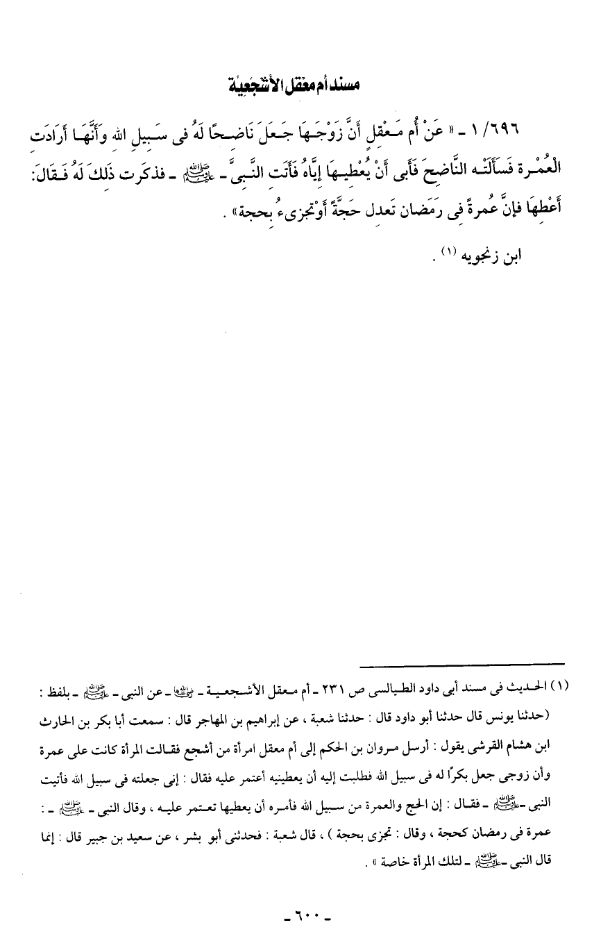 (¬1) الحديث في مسند أَبى داود الطيالسى ص 231 - أم معقل الأشجعية -رضي اللَّه عنها- عن النبى -صلى اللَّه عليه وسلم- بلفظ: (حدثنا يونس قال حدثنا أبو داود قال: حدثنا شعبة، عن إبراهيم بن المهاجر قال: سمعت أبا بكر بن الحارث ابن هشام القرشى يقول: أرسل مروان بن الحكم إلى أم معقل امرأة من أشجع فقالت المرأة كانت على عمرة وأن زوجى جعل بكرًا له في سبيل اللَّه فطلبت إليه أن يعطينيه أعتمر عليه فقال: إنى جعلته في سيل اللَّه فأتيت النبى -صلى اللَّه عليه وسلم- فقال: إن الحج والعمرة من سبيل اللَّه فأمره أن يعطيها تعتمر عليه، وقال النبى -صلى اللَّه عليه وسلم-: عمرة في رمضان كحجة، وقال: تجزى بحجة)، قال شعبة: فحدثنى أبو بشر، عن سعيد بن جبير قال: إنما قال النبى -صلى اللَّه عليه وسلم- لتلك المرأة خاصة".