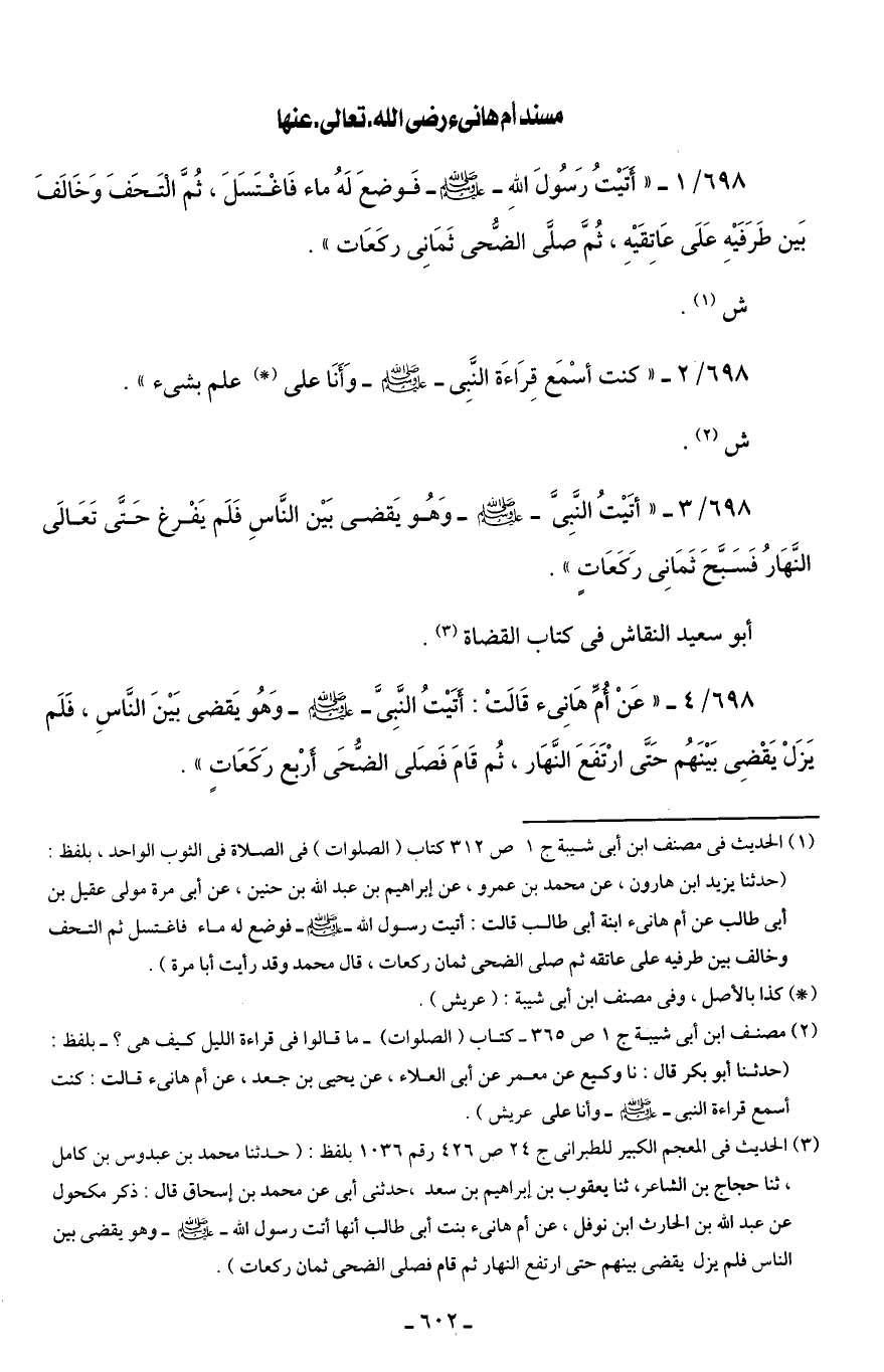 698/ 4 - "عَنْ أُمِّ هَانِئ قَالَتْ: أَتَيْتُ النَّبِىَّ -صلى اللَّه عليه وسلم- وَهُو يَقضى بَيْنَ النَّاسِ، فَلَم يَزَلْ يَقْضِى بَيْنَهُم حَتَّى ارْتَفَعَ النَّهَار، ثُم قَامَ فَصَلى الضُّحَى أَرْبع رَكعَاتٍ".