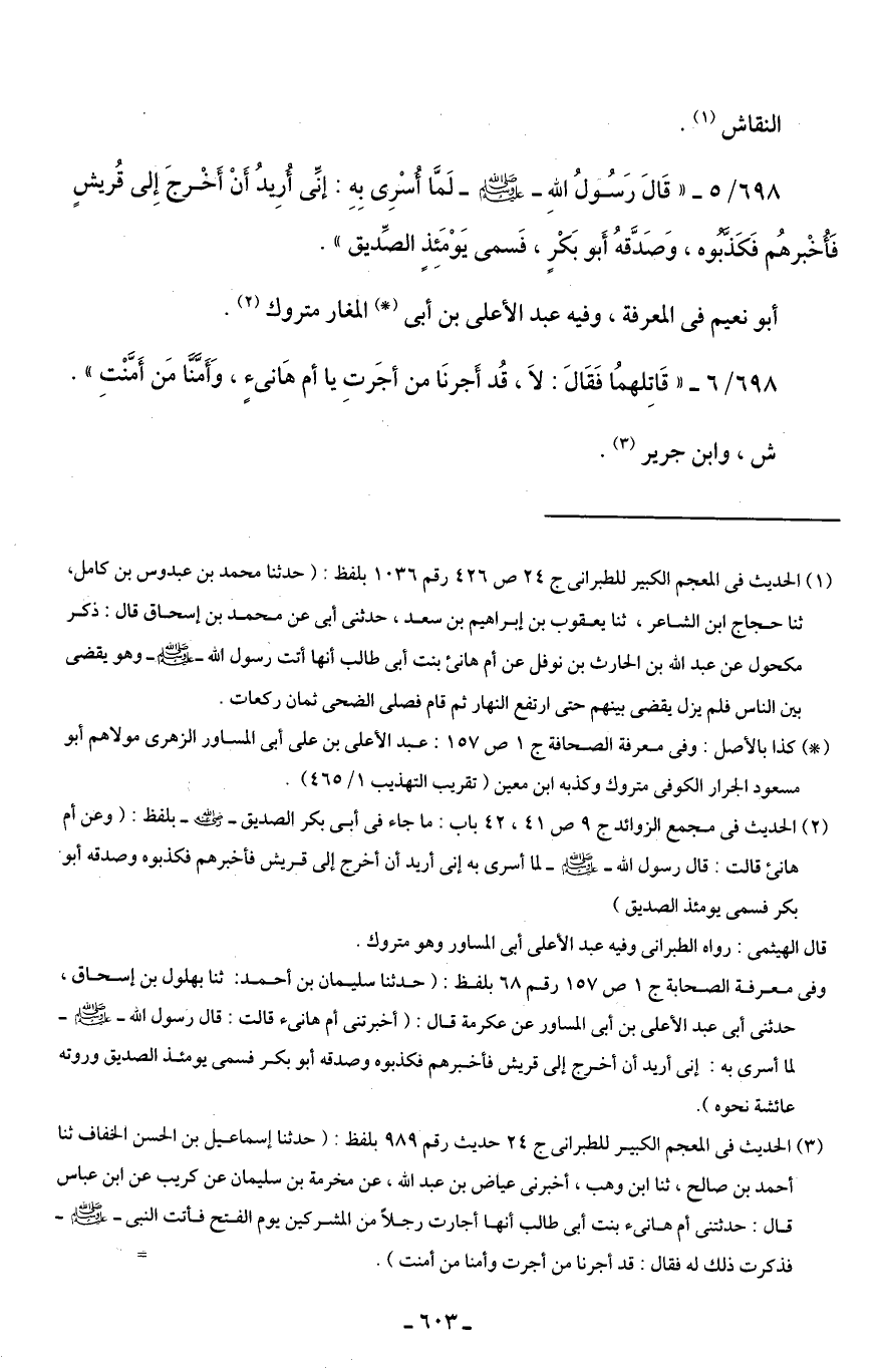 698/ 5 - "قَالَ رَسُولُ اللَّهِ -صلى اللَّه عليه وسلم- لَمَّا أُسْرِى بِهِ: إنِّى أُرِيدُ أَنْ أَخْرجَ إِلى قُريشٍ فَأُخْبرهُم فَكَذَّبُوه، وَصَدَّقهُ أَبو بَكْرٍ، فَسمى يَوْمَئِذٍ الصِّديق".