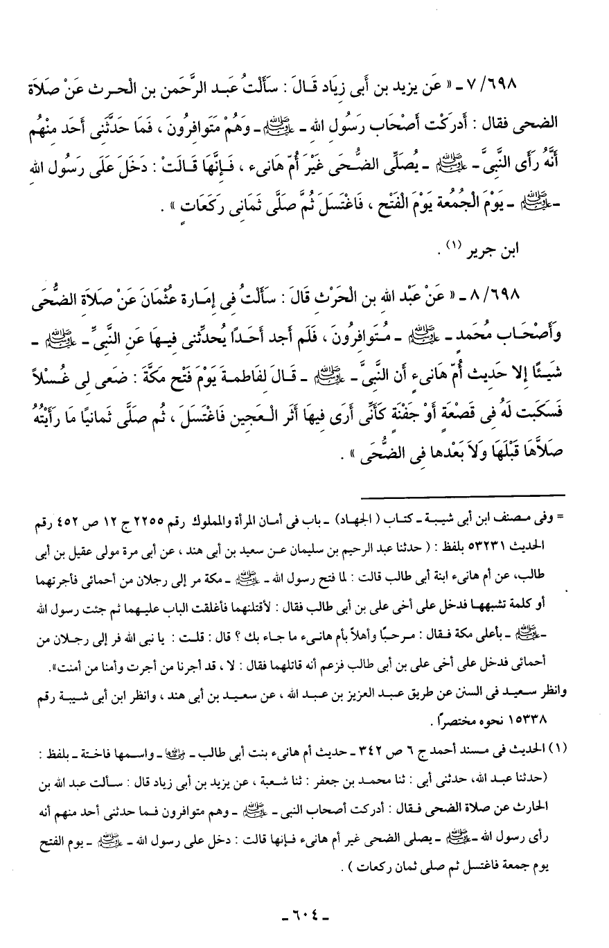 698/ 7 - "عَن يزيد بن أَبى زِيَاد قَالَ: سَأَلْتُ عَبد الرَّحَمن بن الْحرث عَنْ صَلَاة الضحى فقال: أَدرَكْت أَصْحَاب رَسُولِ اللَّهِ -صلى اللَّه عليه وسلم- وَهُمْ مَتَوافِرُونَ، فَمَا حَدَّثنِى أَحَد مِنْهُم أَنَّهُ رَأَى النَّبِىَّ -صلى اللَّه عليه وسلم- يُصَلِّى الضُّحَى غَيْرَ أُمّ هَانئ، فَإِنَّهَا قَالَتْ: دَخَلَ عَلَى رَسُول اللَّهِ -صلى اللَّه عليه وسلم- يَوْمَ الْجُمُعة يَوْمَ الْفَتْح، فَاغْتَسَلَ ثُمَّ صَلَّى ثَمَانِى رَكَعَاتٍ".