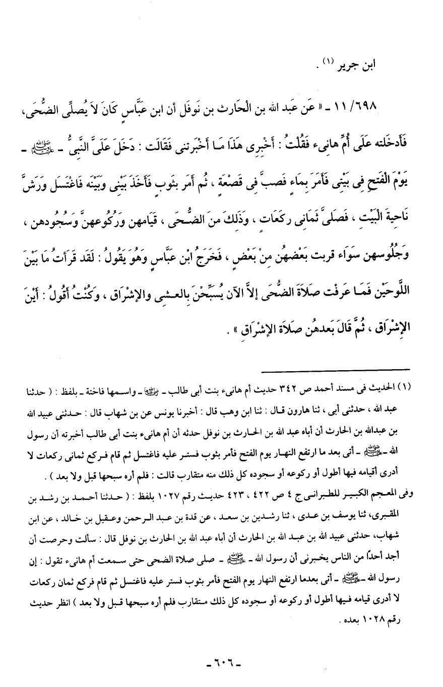 698/ 11 - "عَن عَبد اللَّه بن الْحَارث بن نَوفَل أن ابن عَبَّاسٍ كَانَ لَا يُصلِّى الضُّحَى، فَأَدخَلته عَلَى أُمِّ هانِئ فَقُلْتُ: أَخْبِرِى هَذَا مَا أَخْبَرتنى فَقَالَت: دَخَلَ عَلَىَّ النَّبِىُّ -صلى اللَّه عليه وسلم- يَوْمَ الْفَتح فِى بَيْتِى فَأَمَرَ بِمَاءٍ فَصبَّ فِى قَصْعَةٍ، ثُم أَمَر بثَوبٍ فَأَخَذَ بَيْنِى وَبَيْنَه فَاغْتَسَل وَرَشَّ نَاحِيةَ الْبَيْتِ، فَصَلَّى ثَمَانِى ركَعَاتٍ، وَذَلِكَ منَ الضُّحَى، قَيَامهن وَرُكُوعهنَّ وَسُجُودهن، وَجُلُوسهن سَوَاء قربت بَعْضهُن مِنْ بَعْضٍ، فَخَرجُ ابْن عَبَّاسٍ وَهُوَ يَقُولُ: لَقَد قَرَأتُ مَا بَيْنَ اللَّوحَيْن فَمَا عَرفْت صَلَاةَ الضُّحَى إلَّا الآن يُسَبِّحْنَ بِالعشِى والإشْرَاق، وَكُنْتُ أَقُولُ: أَيْنَ الإِشْرَاق، ثُمَّ قَالَ بَعدهُن صَلَاة الإشْرَاقِ".