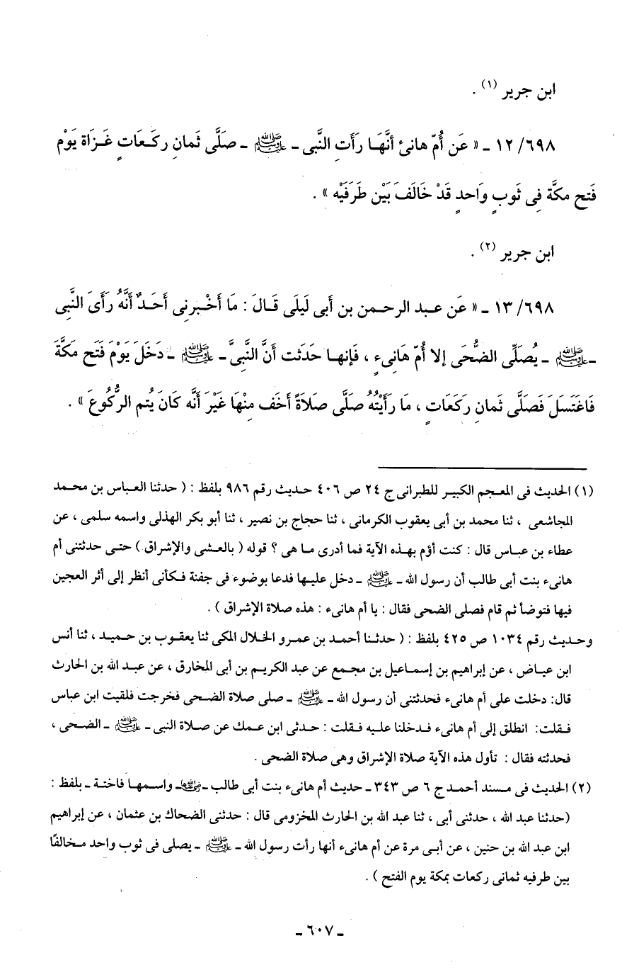 698/ 13 - "عَن عبد الرحمن بن أَبى لَيلَى قَالَ: مَا أَخْبرنِى أَحَدٌ أَنَّهُ رَأَىَ النَّبِى -صلى اللَّه عليه وسلم- يُصَلِّى الضُّحَى إلا أُمّ هَانِئٍ، فَإنها حَدَثت أَنَّ النَّبِىَّ -صلى اللَّه عليه وسلم- دَخَلَ يَوْمَ فَتَح مَكَّةَ فَاغَتَسَلَ فَصَلَّى ثَمانِ رَكَعَاتٍ، مَا رَأَيْتُهُ صَلَّى صَلَاةً أَخَف مِنْهَا غَيْرَ أَنَّه كَانَ يُتم الرُّكُوعَ".