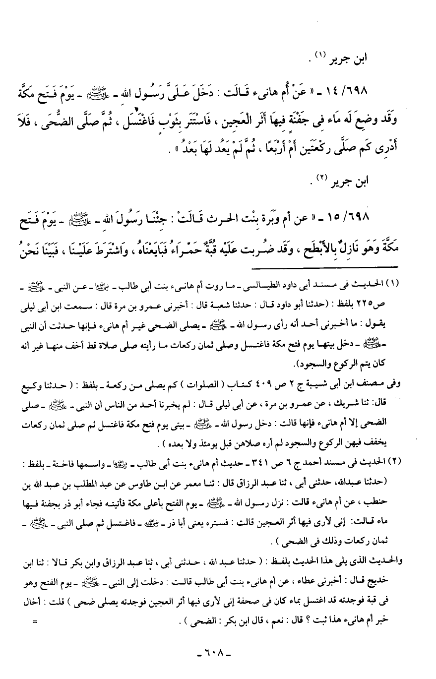 (¬2) الحديث في مسند أحمد جـ 6 ص 341 - حديث أم هانئ بنت أَبى طالب -رضي اللَّه عنها- واسمها فاختة -بلفظ: (حدثنا عبد اللَّه، حدثنى أَبى، ثنا عبد الرزاق قال: ثنا معمر عن ابن طاوس عن عبد المطلب بن عبد اللَّه بن حنطب، عن أم هانئ قالت: نزل رسول اللَّه -صلى اللَّه عليه وسلم- يوم الفتح بأعلى مكة فأتيته فجاء أبو ذر بجفنة فها ماء قالت: إنى لأرى فيها أثر العجين قالت: فستره يعنى أبا ذر -رضي اللَّه عنه- فاغتسل ثم صلى النبى -صلى اللَّه عليه وسلم- ثمان ركعات وذلك في الضحى).
