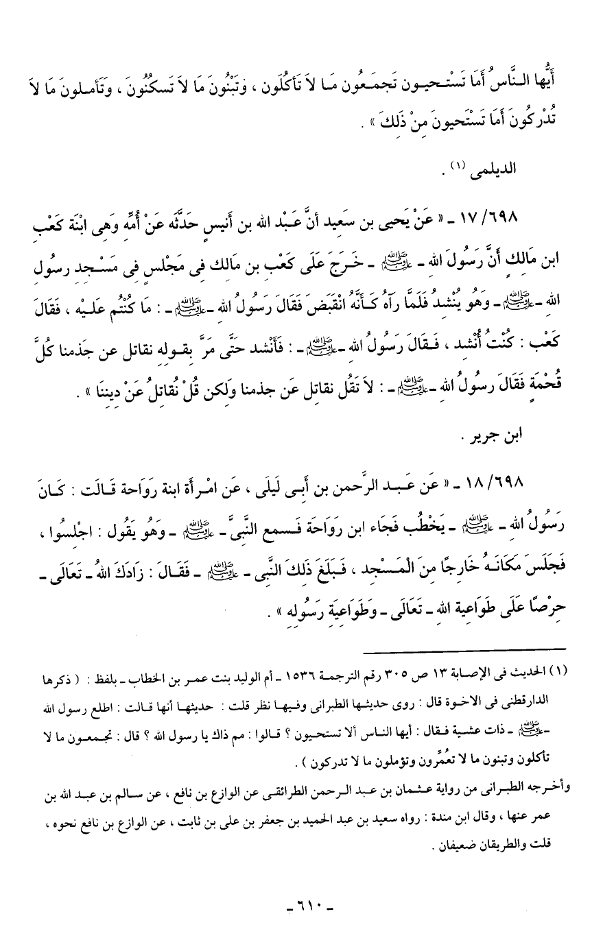 (¬1) الحديث في الإصابة 13 ص 305 رقم الترجمة 1536 - أم الوليد بنت عمر بن الخطاب -بلفظ: (ذكرها الدارقطنى في الاخوة قال: روى حديثها الطبرانى وفيها نظر قلت: حديثها أنها قالت: اطلع رسول اللَّه -صلى اللَّه عليه وسلم- ذات عشية فقال: أيها الناس ألا تستحيون؟ قالوا: مم ذاك يا رسول اللَّه؟ قال: تجمعون ما لا تأكلون وتبنون ما لا تعُمِّرون وتؤملون ما لا تدركون).