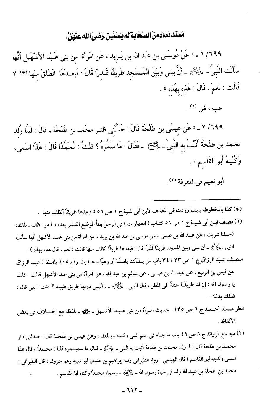 699/ 2 - "عَن عِيسَى بن طَلْحَة قَالَ: حَدَّثَنِي ظئر محَمد بن طَلْحَةَ، قَالَ: لَمَّا وُلِد محمد بن طلْحَةَ أَتَيْتُ بِهِ النَّبِىَّ -صلى اللَّه عليه وسلم- فَقَالَ. مَا سَمُّوهُ؟ قلتُ: مُحَمَّدًا قَالَ: هَذَا اسْمى، وَكُنْيتهُ أُبو القَاسِم".