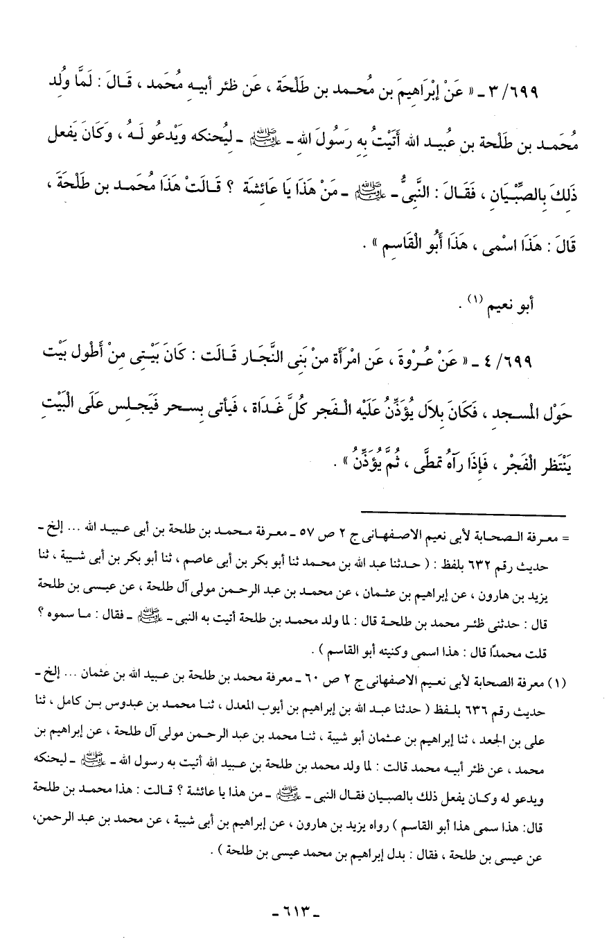 699/ 3 - "عَنْ إبْرَاهِيمَ بن مُحمد بن طَلْحَة، عَن ظئر أبيهِ مُحَمد، قَالَ: لَمَّا وُلِد مُحَمد بن طَلْحة بن عُبيد اللَّه أَتَيْتُ بِهِ رَسُولَ اللَّهِ -صلى اللَّه عليه وسلم- لِيُحنكه وَيْدعُو لَهُ، وَكَانَ يَفعل ذَلِكَ بِالصِّبْيَانِ، فَقَالَ: النَّبِىُّ -صلى اللَّه عليه وسلم- مَنْ هَذَا يَا عَائِشَة؟ قَالَتْ هَذَا مُحَمد بن طَلْحَةَ، قَالَ: هَذَا اسْمى، هَذَا أَبُو الْقَاسِم".