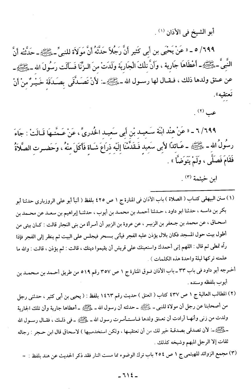 (¬2) المطالب العالية جـ 1 ص 437 كتاب (العتق) حديث رقم 1463 بلفظ: (يحيى بن أَبى كثير، حدثنى رجل من أصحابنا عن رجل أن مولاة للنبى -صلى اللَّه عليه وسلم- حدثته أن رسول اللَّه -صلى اللَّه عليه وسلم- أعطاها جارية وأن تلك الجارية ولدت من زنى وأنها أرادت أن تعتق ولدها فاستأمرت رسول اللَّه -صلى اللَّه عليه وسلم- في ذلك، فقال رسول اللَّه -صلى اللَّه عليه وسلم-: لأن تصدقى بصدقة خير لك لمن أن تعتقيها، ولكن استخدميها) لاسحاق قال ابن حجر: رجاله ثقات إلا الرجل المبهم وشيخه كذلك.