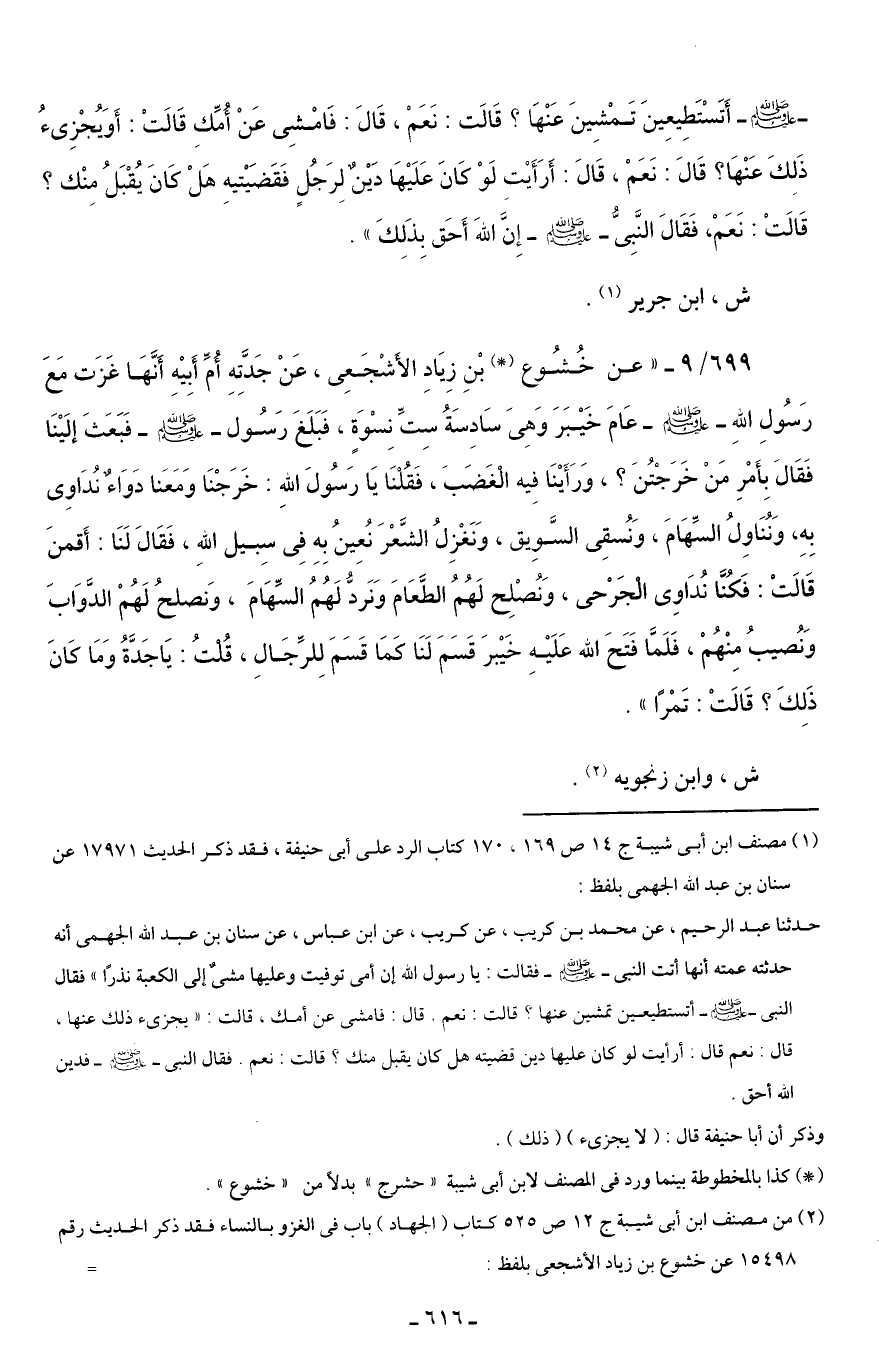 699/ 9 - "عن خُشُوع (*) بْنِ زِيَادِ الأَشْجَعِى، عَنْ جَدَّتِهِ أُمِّ أَبِيْهِ أَنَّهَا غَزَت مَعَ رَسُولِ اللَّهِ -صلى اللَّه عليه وسلم- عَامَ خَيْبَرَ وَهِىَ سَادِسَةُ سِتِّ نِسْوَةٍ، فَبَلَغَ رَسُول -صلى اللَّه عليه وسلم- فَبَعَثَ إلَيْنَا فَقَالَ بِأَمْرِ مَنْ خَرَجْتُنَ؟ ، وَرَأَيْنَا فِيه الْغَضَبَ، فَقُلْنَا يَا رَسُولَ اللَّهِ: خَرَجْنَا وَمَعَنا دَوَاءٌ نُدَاوِى بِهِ، وَنُنَاوِلُ السِّهَامَ، وَنُسقِى السَّوِيق، وَنَغْزِلُ الشَّعْرَ نُعِينُ بِهِ فِى سِبيل اللَّهِ، فَقَالَ لَنَا: أَقمنَ قَالَتْ: فَكُنَّا نُدَاوِى الْجَرْحى، وَنُصْلِح لَهُمُ الطَّعَامَ وَنَردُّ لَهُمُ السِّهَامَ، وَنصلحُ لَهُمْ الدَّوَابَ وَنُصيبُ مِنْهُمْ، فَلَمَّا فَتَحَ اللَّه عَلَيْهِ خَيْبرَ قَسَمَ لَنَا كَمَا قَسَمَ لِلرِّجَالِ، قُلْتُ: يَاجَدَّةُ وَمَا كَانَ ذَلِكَ؟ قَالَتْ: تَمْرًا".