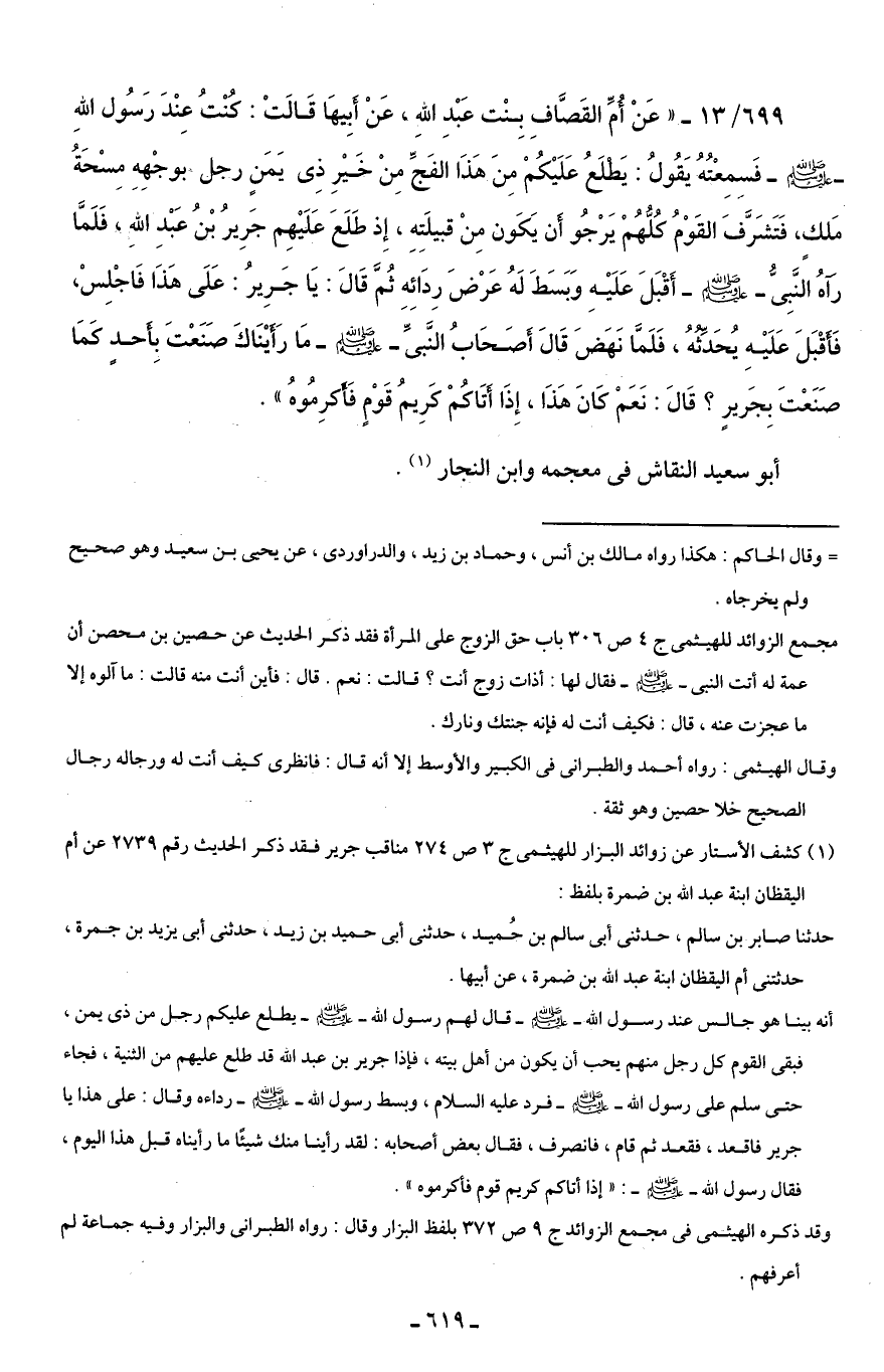 699/ 13 - "عَنْ أُمِّ القَصَّافِ بِنْت عَبْدِ اللَّهِ، عَنْ أَبِيهَا قَالَتْ: كُنْتُ عِنْدَ رَسُول اللَّهِ -صلى اللَّه عليه وسلم- فَسِمِعْتُهُ يَقُولُ: يَطْلَعُ عَلَيْكُمْ مِنَ هَذَا الفَجِّ مِنْ خَيْرِ ذِى يَمَنٍ رجل بوجْهِهِ مِسْحَةُ مَلكٍ، فَتَشَرَّفَ القَوْمُ كُلُّهُمْ يَرْجُو أَن يَكَون مِنْ قبيلَتِهِ، إِذ طَلَعَ عَلَيْهِم جَرِيرُ بْنُ عَبْدِ اللَّهِ، فَلَمَّا رآهُ النَّبِىُّ -صلى اللَّه عليه وسلم- أَقْبَلَ عَلَيْهِ وَبَسَطَ لَهُ عَرْضَ رِدَائِه ثُمَّ قَالَ: يَا جَرِيرُ: عَلَى هَذَا فَاجْلِسْ، فَأَقْبَلَ عَلَيْهِ يُحَدِّثُهُ، فَلَمَّا نَهَضَ قَالَ أَصَحَابُ النَّبىِّ -صلى اللَّه عليه وسلم- مَا رَأَيْنَاكَ صَنَعْتَ بِأَحدٍ كَمَا صَنَعْتَ بِجَريرٍ؟ قَالَ: نَعَمْ كَانَ هَذَا، إِذَا أَتَاكُمْ كَرِيمُ قَوْمٍ فَأَكرِمُوهُ".