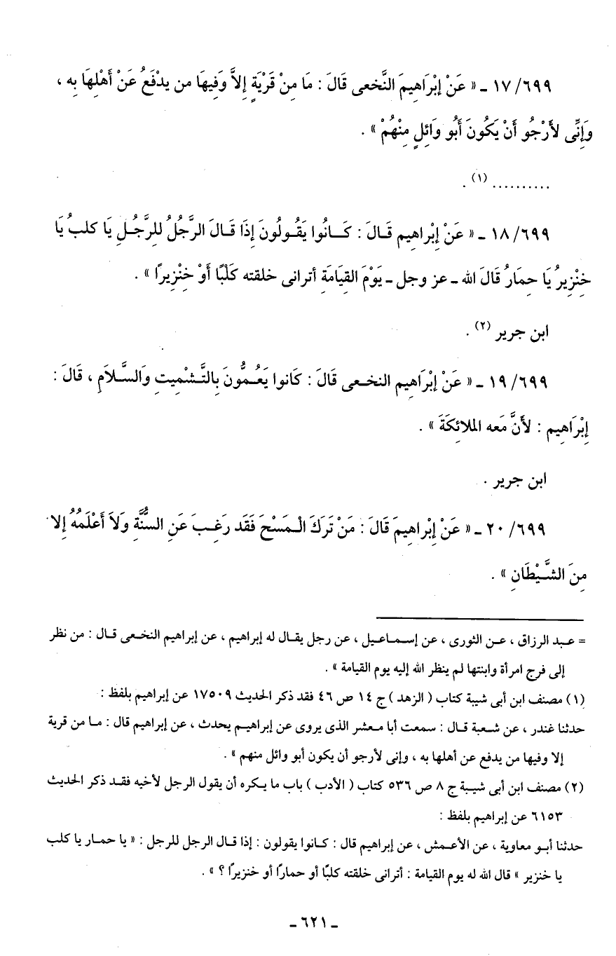 699/ 20 - "عَنْ إِبْراهِيمَ قَالَ: مَنْ تَرَكَ الْمَسْحَ فَقَد رَغِبَ عَنِ السُّنَّةِ وَلَا أَعْلَمُهُ إِلا مِنَ الشَّيْطَانِ".