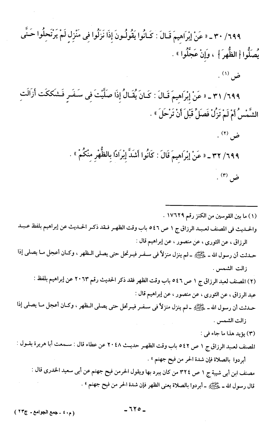 699/ 32 - "عَنْ إبْرَاهِيمَ قَالَ: كَانُوا أَشَدَّ إِبْرَادًا بِالظُّهْرِ مِنْكُمْ".