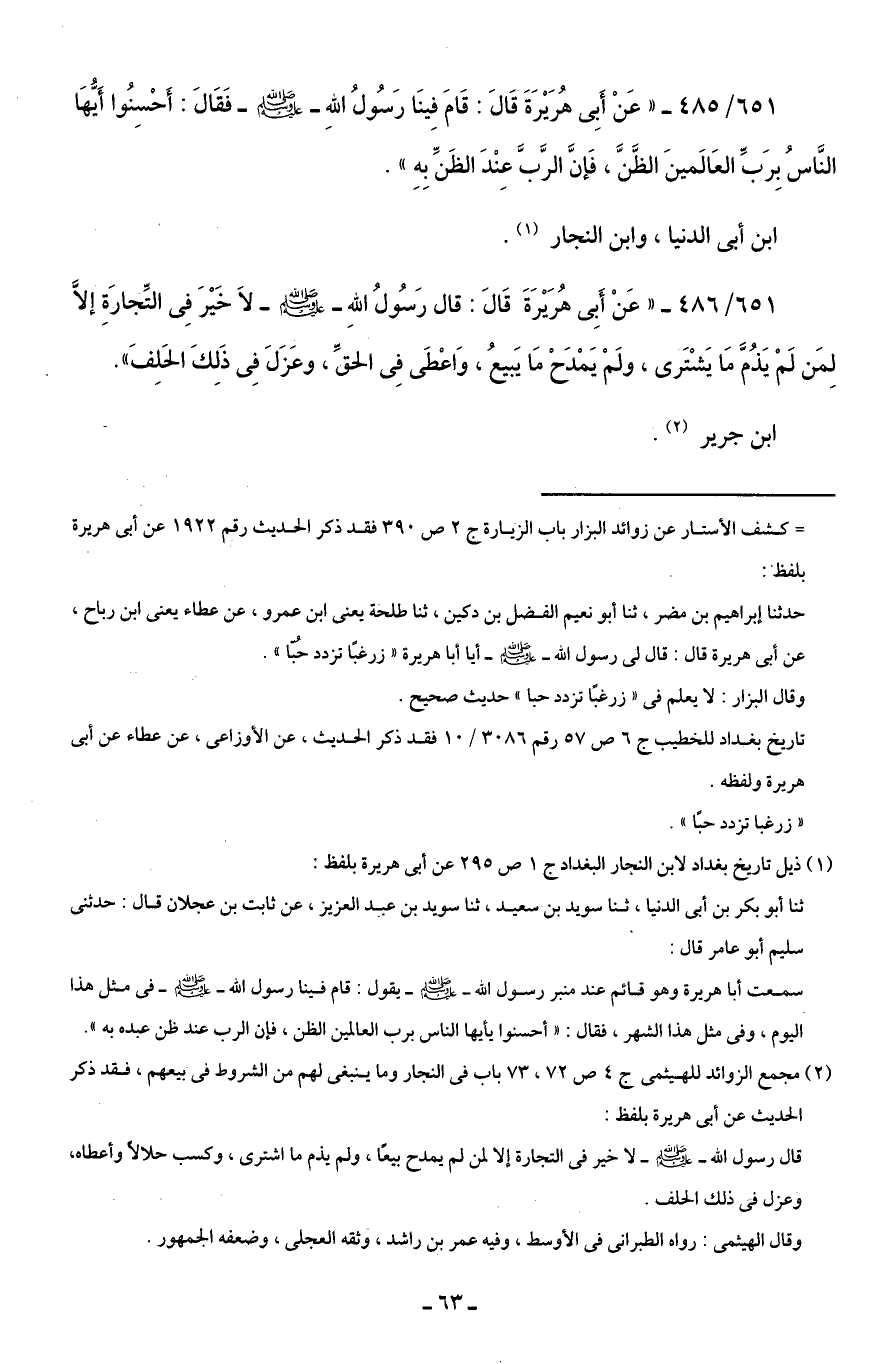 651/ 485 - "عَنْ أَبِي هُرَيْرَةَ قَالَ: قَامَ فِينَا رَسُولُ اللهِ - صلى الله عليه وسلم - فَقَالَ: أَحْسِنُوا أَيُّهَا النَّاسُ بِرَبِّ العَالَمينَ الظَّنَّ، فَإنَّ الرَّبَّ عِنْدَ الظَنِّ بِهِ".