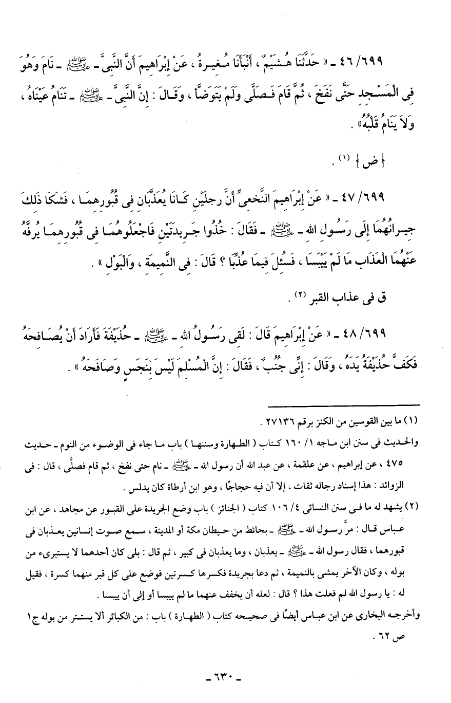 699/ 48 - "عَنْ إِبْرَاهِيمَ قَالَ: لَقِى رَسُولُ اللَّهِ -صلى اللَّه عليه وسلم- حُذَيْفَةَ فَأَرَادَ أَنْ يُصَافِحَهُ فَكَفَّ حُذَيْفَةُ يَدَهُ، وَقَالَ: إِنِّى جُنُبٌ، فَقَالَ: إِنَّ الْمُسْلِمَ لَيْسَ بِنَجَسٍ وَصَافَحَهُ".