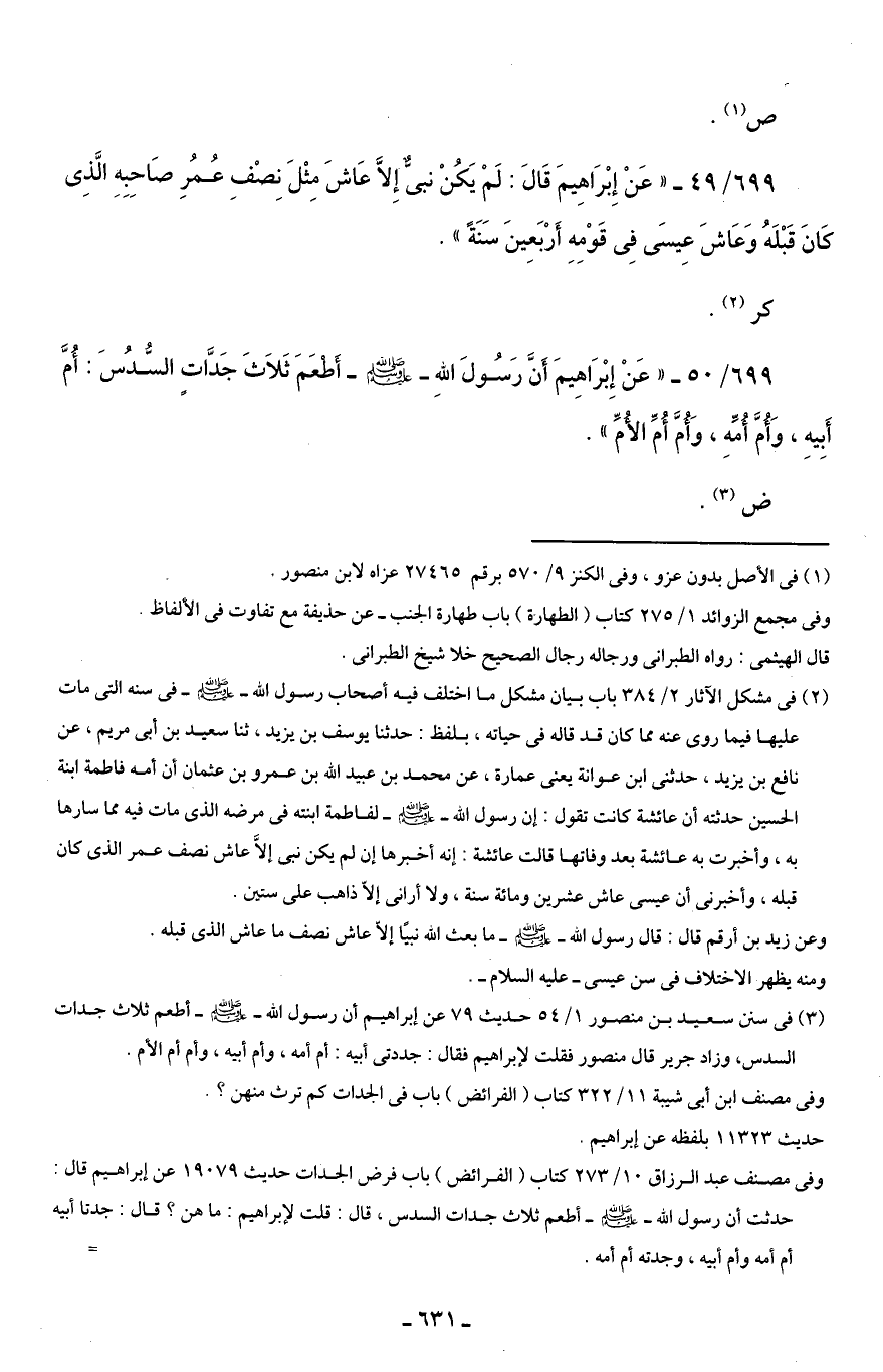 699/ 50 - "عَنْ إِبْرَاهِيمَ أَنَّ رَسُولَ اللَّهِ -صلى اللَّه عليه وسلم- أَطعَمَ ثَلَاثَ جَدَّاتٍ السُّدُسَ: أُمَّ أَبِيهِ، وَأُمَّ أُمِّهِ، وَأُمَّ أُمِّ الأُمِّ".