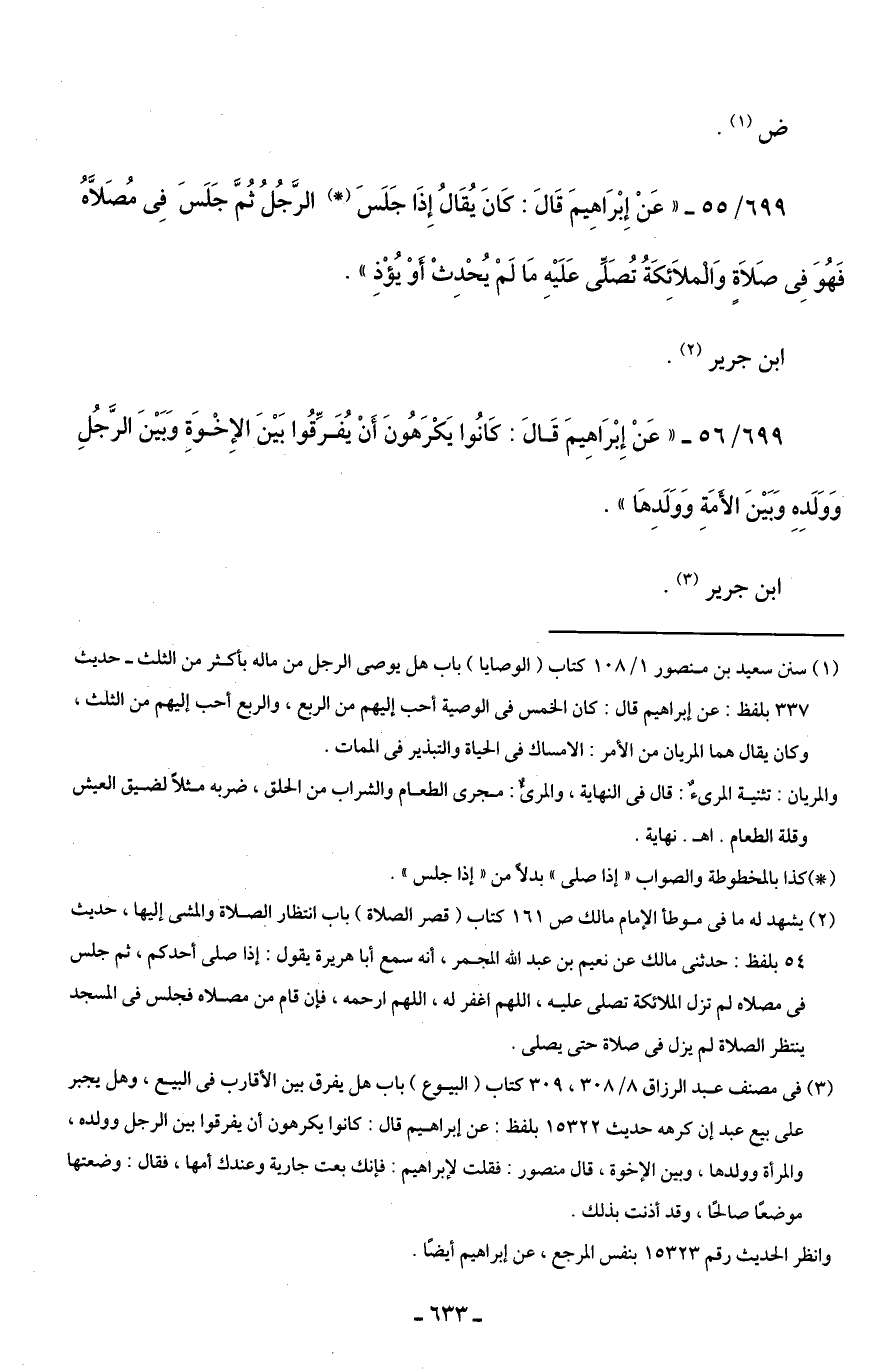 699/ 55 - "عَنْ إِبْرَاهِيمَ قَالَ: كَانَ يُقَالُ إِذَا جَلَسَ (*) الرَّجُلُ ثُمَّ جَلَسَ فِى مُصَلَّاهُ فَهُوَ فِى صَلَاةٍ وَالْملَائِكَةُ تُصَلِّى عَلَيْهِ مَا لَمْ يُحْدِثْ أَوْ يُؤْذِ".