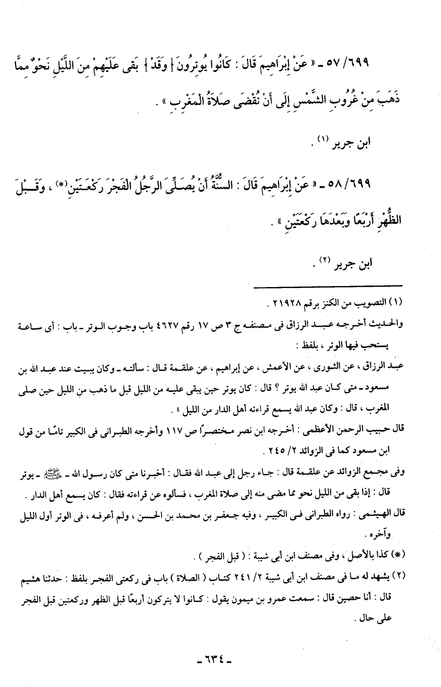 699/ 57 - "عَنْ إِبْرَاهِيمَ قَالَ: كَانُوا يُوتِرُونَ [وَقَدْ] بَقى عَلَيْهِمْ مِنَ اللَّيْلِ نَحْوٌ مِمَّا ذَهَبَ مِنْ غُرُوبِ الشَّمْسِ إِلَى أَنْ تُقْضَى صَلَاةُ الْمَغْرِبِ".