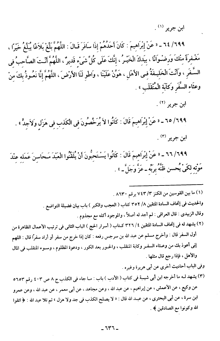699/ 64 - "عَنْ إِبْرَاهِيمَ: كَانَ أَحَدُهُمْ إِذَا سَافَرَ قَالَ: اللَّهُمَّ بَلِّغْ بَلَاغًا يُبَلِّغُ خَيْرًا، مَغْفِرَةً مِنْكَ وَرِضْوَانًا، بِيَدِكَ الْخَيْرُ، إِنَّكَ عَلَى كُلِّ شَىْءٍ قَدِيرٌ، اللَّهُمَّ أَنْتَ الصَّاحِبُ فِى السَّفَرِ، وَأَنْتَ الْخَلِيفَةُ فِى الأَهْلِ، هَوِّنْ عَلَيْنَا، وَاطْوِلَنَا الأَرْضَ، اللَّهُمَّ إِنَّا نَعُوذُ بِكَ مِنْ وعثَاءِ السَّفَرِ وَكآبَةِ الْمُنْقَلَبِ".