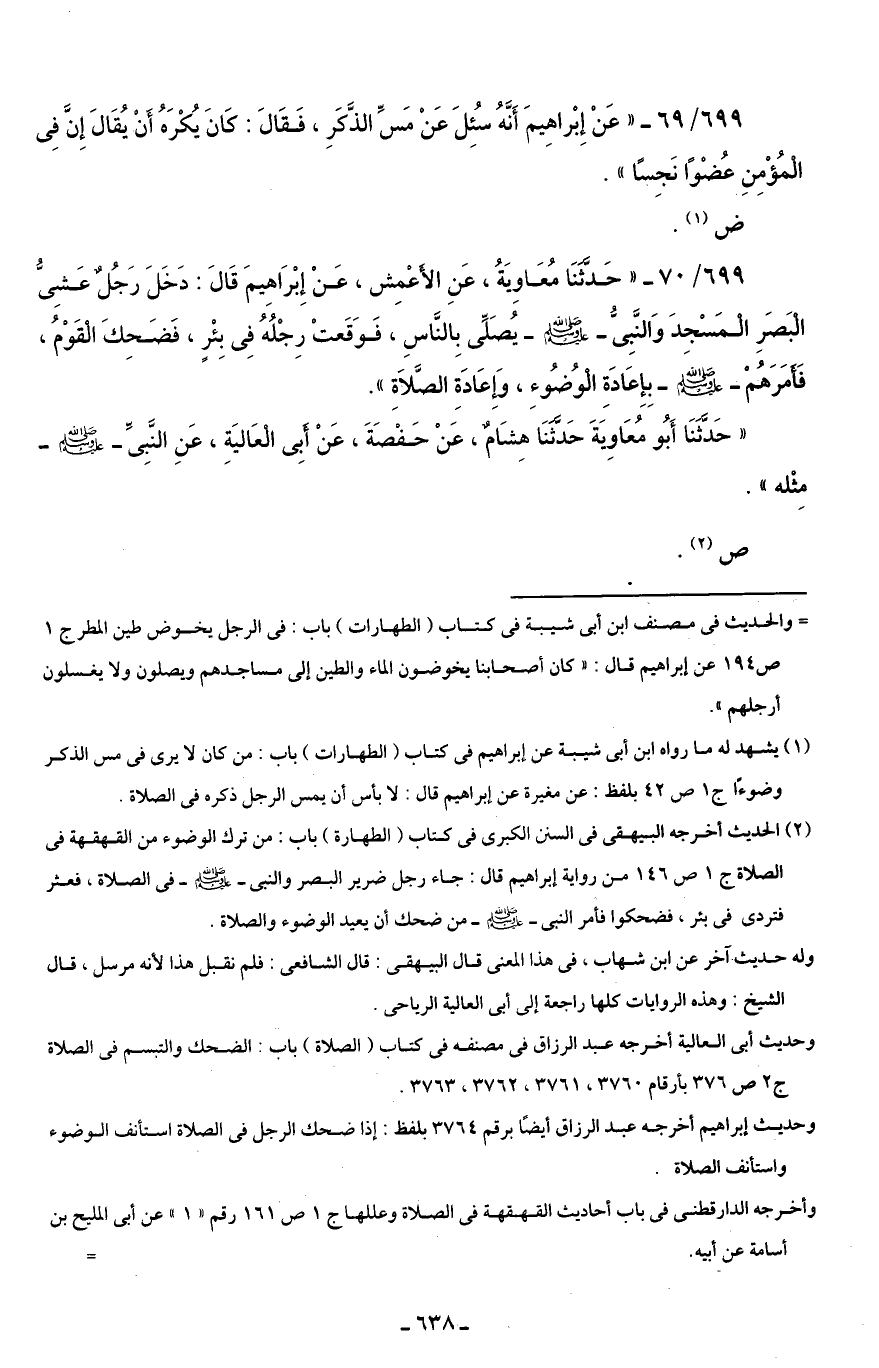 699/ 69 - "عَنْ إِبْراهِيمَ أَنَّهُ سُئِلَ عَنْ مَسِّ الذَّكَرِ، فَقَالَ: كَانَ يُكْرَهُ أَنْ يُقَالَ إِنَّ فِى الْمُؤْمِنِ عُضْوًا نَجِسًا".