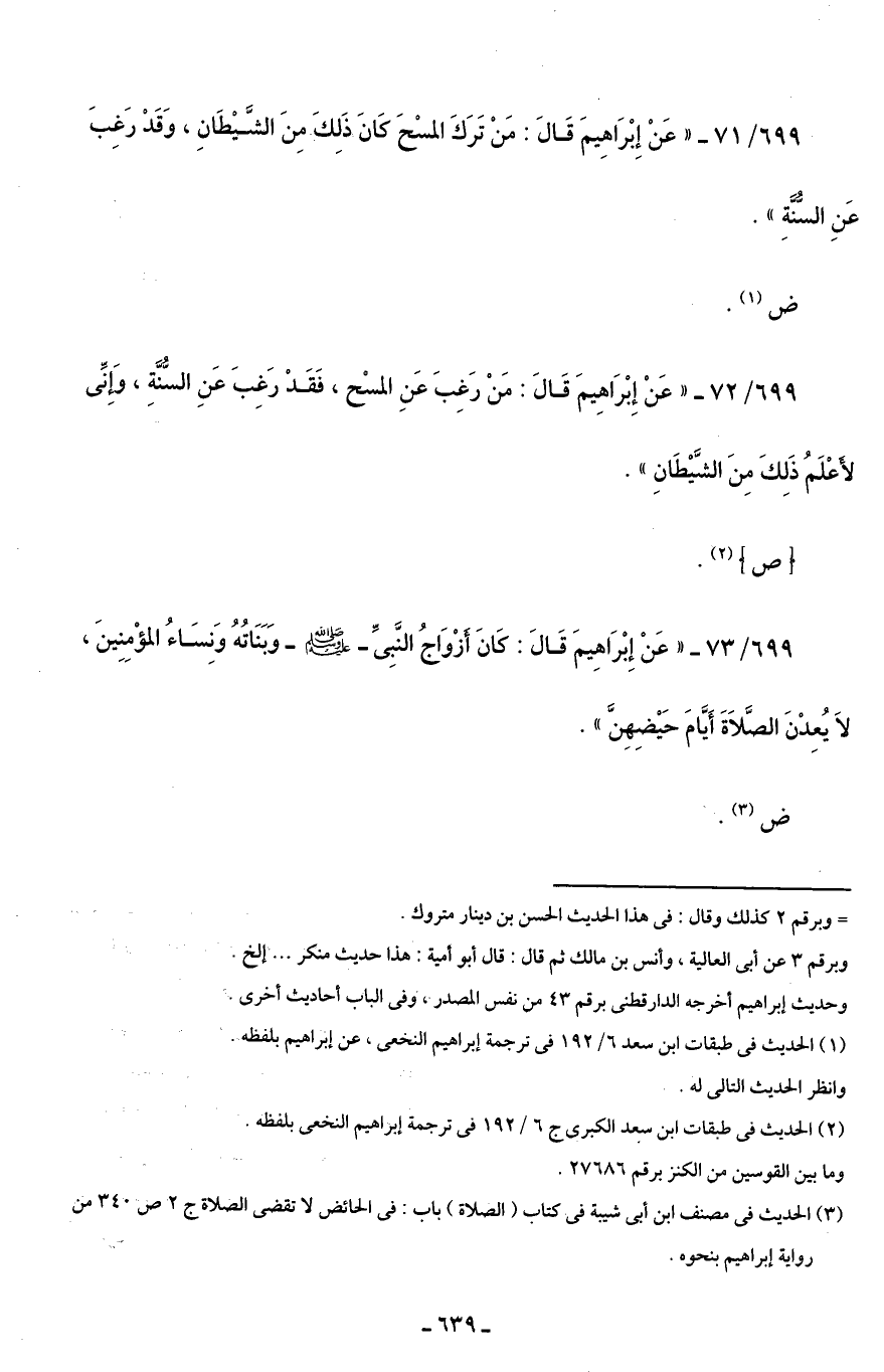699/ 72 - "عَنْ إِبْرَاهِيمَ قَالَ: مَنْ رَغِبَ عَنِ المسْح، فَقَدْ رَغِبَ عَنِ السُّنَّةِ، وَإنِّى لأَعْلَمُ ذَلِكَ مِنَ الشَّيْطَانِ".